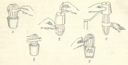 Пересадку кактусів роблять навесні, коли вони починають рости. Це буває у квітні та на початку травня. За два-три дні до пересадки їх перестають поливати, щоби земля легше відстала від коріння. Рослини обертають смугами товстого паперу або ремінцями (рис. 1) і вибивають із горщика. Земляний ком можна штовхати паличкою через отвір у дні перевернутого горщика. Мертві та загнилі коріння відрізають до живої тканини. Усі зрізи обсипають вугільним порошком.