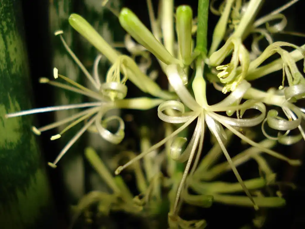 Листя сансевієри - мечоподібної форми, шкірясте, зі смугастим малюнком. Вони можуть бути світло-і темно-зелені, а смужки кремові або жовті, що йдуть по краю, або темне, що розкреслює сріблясто-зелене листя. Найпоширеніший у кімнатній культурі вид — трисмугова сансевієра. У неї плоске велике листя, прикрашене темно-зеленими хвилястими смугами. Цвіте у квітні-травні, наповнюючи кімнату ароматом ванілі. У період цвітіння рослина викидає стрілку з маленькими, біло-зеленими або рожево-фіолетовими квіточками, зібраними в циліндричне чи головчасте суцвіття.