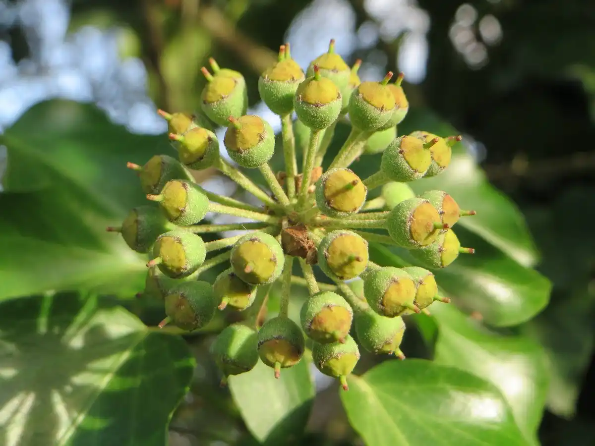 Цвіте плющ у культурі рідко, у віці 10-12 років. Квітки непоказні, дрібні, зібрані в зонтикоподібні суцвіття, з неприємним запахом. Після цвітіння утворюються ягоди, дуже отруйні. Тому навіть якщо ваша рослина і набере бутони, залишати їх не варто.