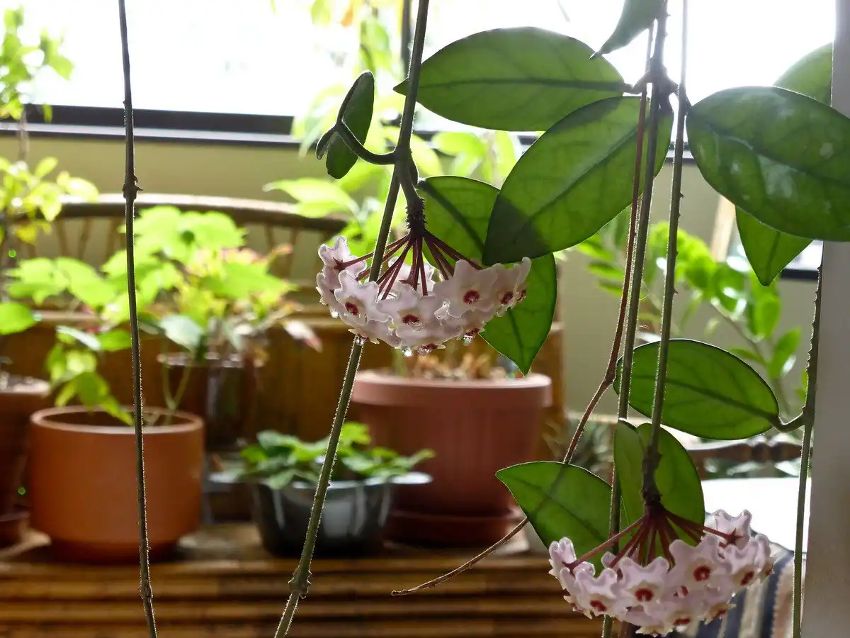 Витка рослина з темно-зеленим шкірястим листям і м'ясистими квітками до 1,5 см в діаметрі, схожими на воскові і зібраними в парасольки суцвіть.