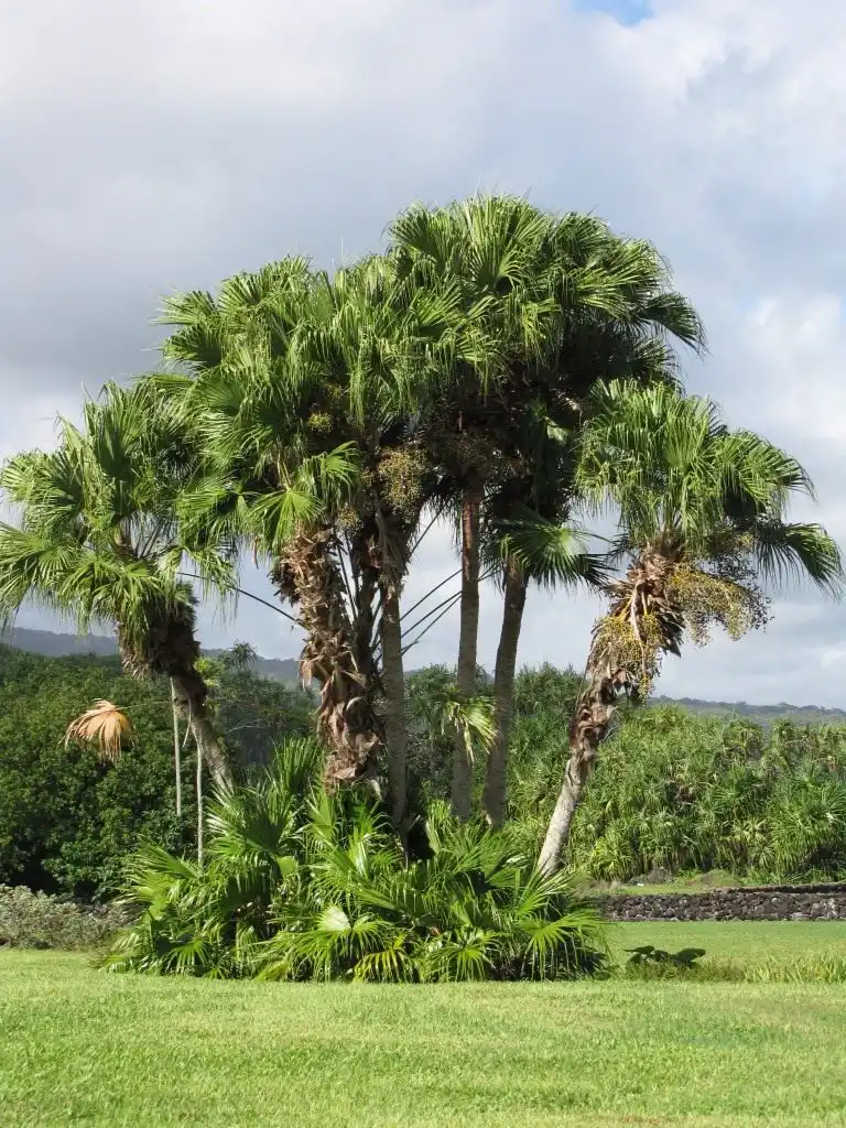 Лівістона круглолиста (Livistona rotundifolia). Росте у прибережній зоні на піщаних ґрунтах на острові Ява та Молуккських островах. Стовбур 10-12 (до 14) м заввишки і 15-17 см у діаметрі. Листя віяло, округле, 1-1,5 м в діаметрі, розсічені на 2/3 довжини на складчасті частки, що відходять навколо рівномірно від верхньої частини черешка, зелені, глянсові. Черешок 1,5 м завдовжки, густо покритий шипами по краях від основи приблизно до 1/3 довжини. Суцвіття пазушне, 1-1,5 м завдовжки, червоне. Квітки жовті.
