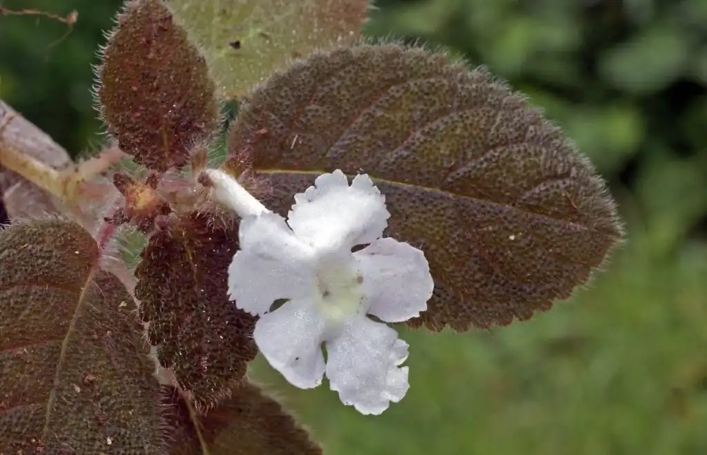 Листя дрібне, довжиною 3 см, шириною 2 см, еліптичне до яйцеподібних, по краю городчасте, темно-зелене з пурпурною середньою жилкою, коротко-оксамитовоопушене. Квітки поодинокі, білі з пурпуровими крапками в зіві і бахромчастими по краю частками відгину. Є низка високодекоративних сортів.