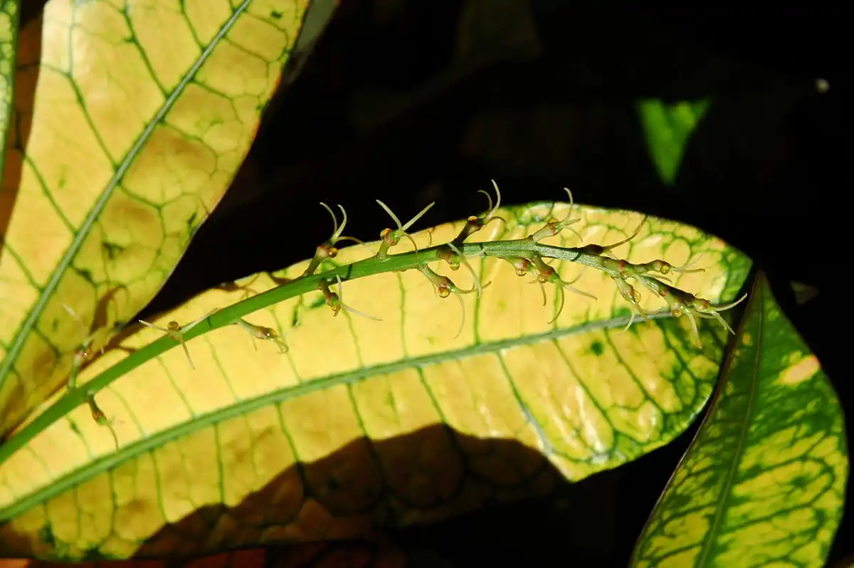 При правильному догляді та регулярному підживленні кротон регулярно цвіте. Але квітки його білі або жовті, дрібні та непоказні, відбирають у рослини багато життєвих сил та поживних речовин, тому їх обривають.