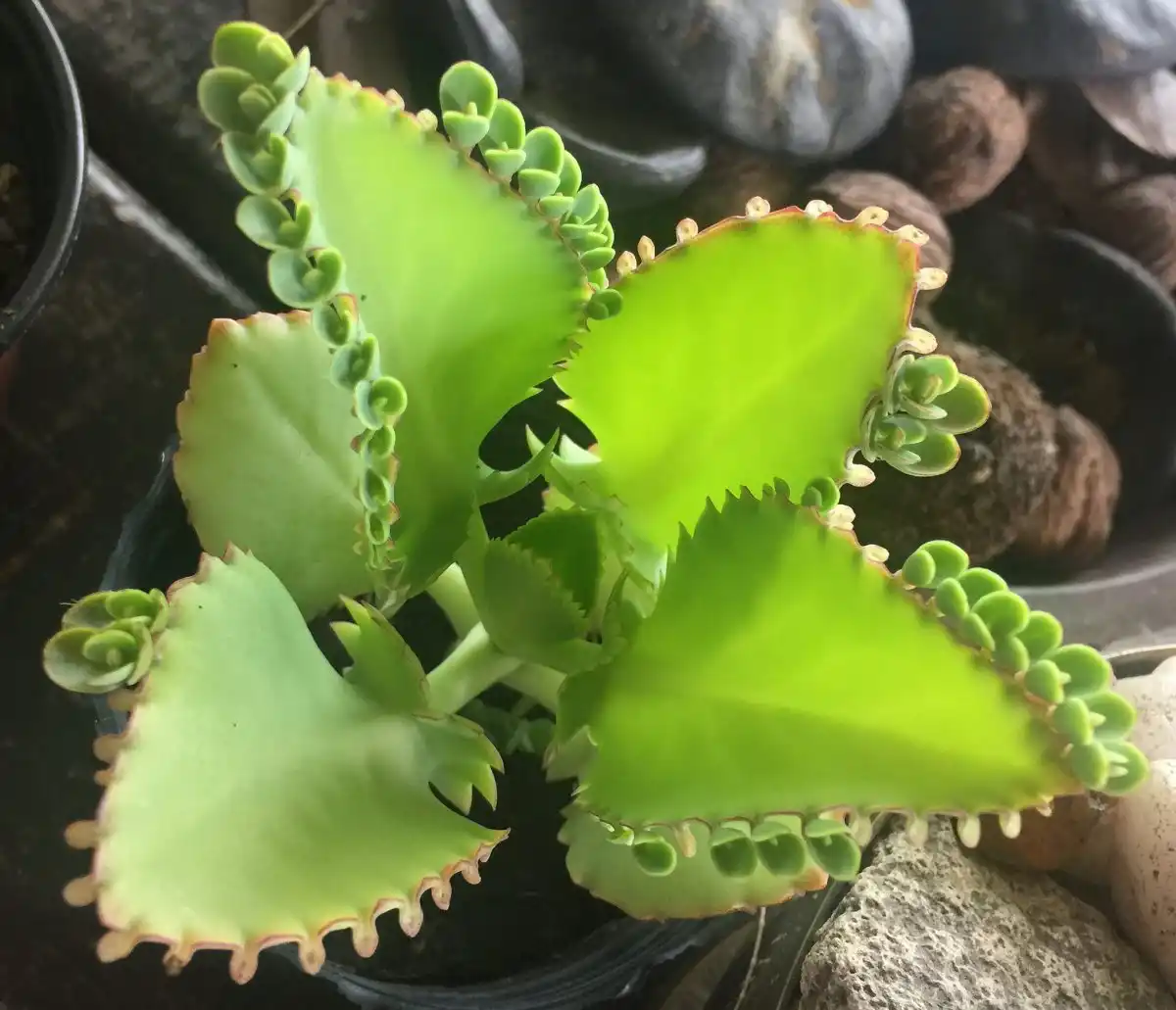 Зовні ці два види трохи схожі - те ж супротивно розташоване листя і така ж величезна кількість діток, що тулиться між зубчиками листової пластини. Відмінність полягає лише в тому, що у каланхое перистого (Bryophyllum pinnatum) Листя має однотонне зелене забарвлення з сизим відтінком і форма листа акуратна, овальна, з загостреним кінчиком.