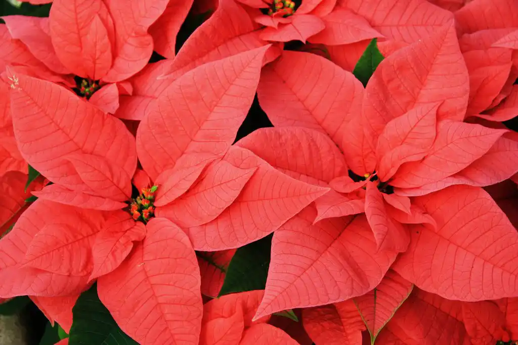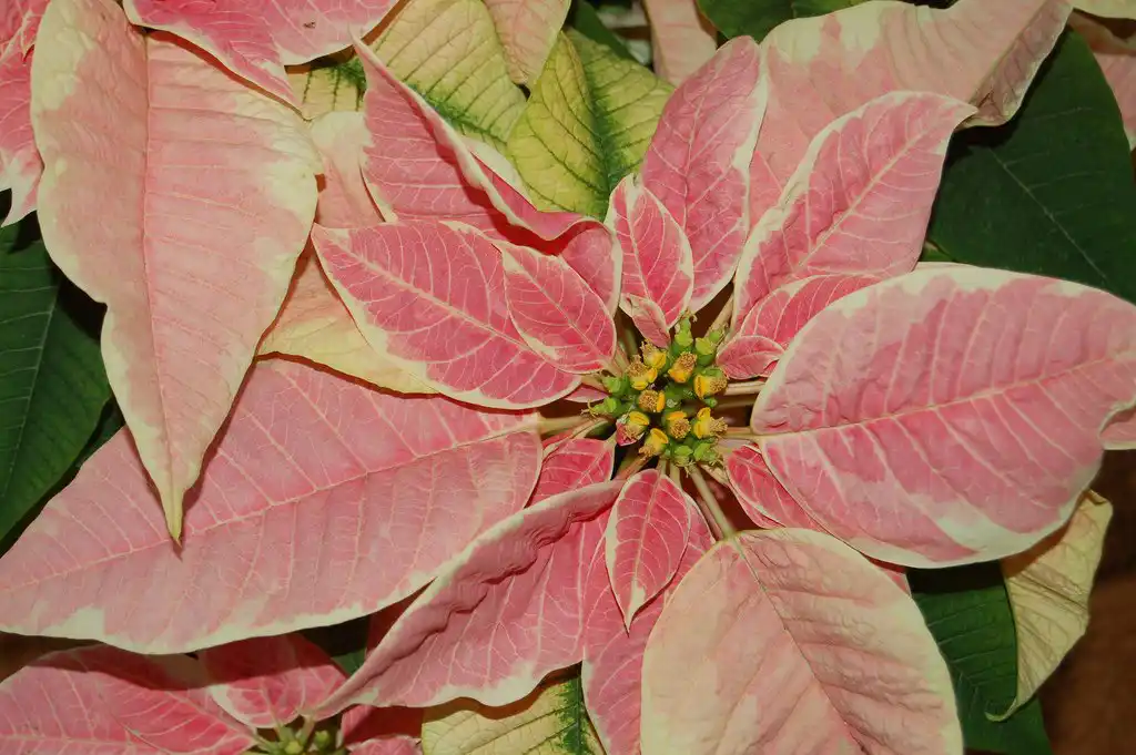 Вони сидять щільно, створюючи приголомшливу форму «зірки». Самі квіти та суцвіття пуансеттій майже не видно – непоказні, дрібні, вони непомітні на тлі розкішного верхівкового листя з яскравим забарвленням. Жовте забарвлення надає їм схожість з пильовиками, і ця ілюзія посилює подібність розеток прикольного листя з квітками. У міру відцвітання ця головна прикраса рослини перефарбовується і зливається із звичайним листям, а потім прицвіте листя поступово опадає.