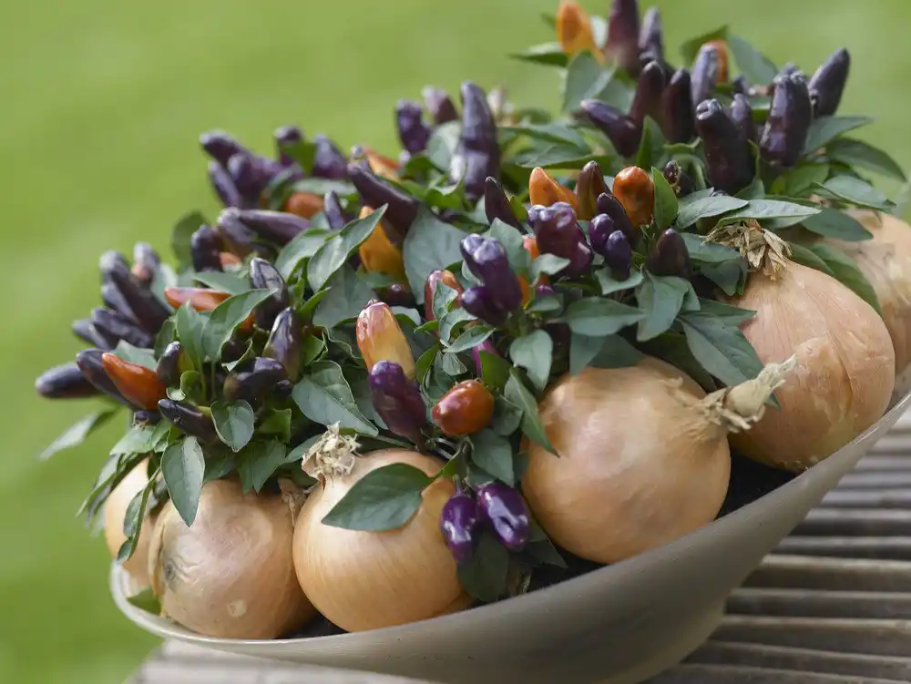 Перець чилі сорту «Кордара» вірний жовтому кольору, його золотисті плоди також спрямовані нагору. Ефектну композицію з ним складе декоративний перчик «Фоксту» з яскраво-червоними плодами. Це відносно новий ранньостиглий сорт, плоди можна знімати вже зеленими, або довести їх до високого стиглості та гостроти.
