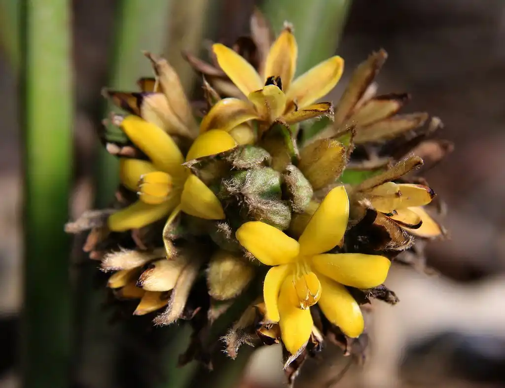 Цвітіння куркуліго-молінерій рідко називають декоративним, але зовсім не примітним його не назвеш. Сірувато-жовті, з приглушеним забарвленням, лілії, що чимось нагадують, квітки з масивними тичинками зібрані в невеликі кисті і головки суцвіть біля самого основи листя. Квітки ніби сором'язливо ховаються під такими ж у довжину, як і сама квітка, приквітками, декоративна густа галявина яких робить всю рослину дуже екзотичною. Порівняння з ліліями не випадково: квітка складається з відігнутих назад, трикутно-ланцетних, загострених на краях чашолистків.