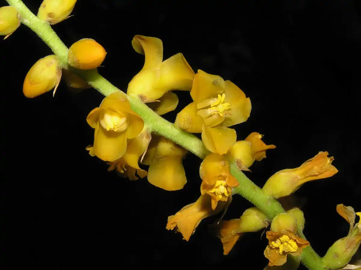 Цвітіння дике дуже декоративне, хоча цінується рослина не через нього. На високих, довгих, з ланцетним листям квітконосах височіють над розетками невеликі кисті або колосся з дзвіночків. Помаранчеве забарвлення відмінно контрастує з усіма відтінками листя і надає рослині ще більшої оригінальності.