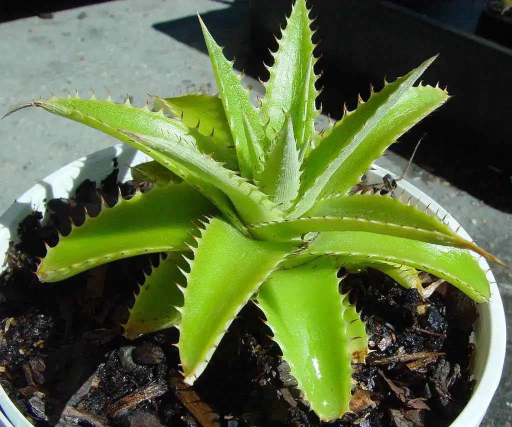 Дикі коротколисті (Dyckia brevifolia) – красива і дуже ошатна рослина із зібраним у щільні розетки трикутним листям довжиною до 12 см при ширині всього до 3х см. Їх загострений кінчик, пильчастий край, шипи-гачки прикрашають рослину. Товсті прямі квітконоси листяні, вінчаються колосками суцвіть, які можуть бути як щільними, так і досить пухкими. Квіти пофарбовані в жовтий сонячний тон.