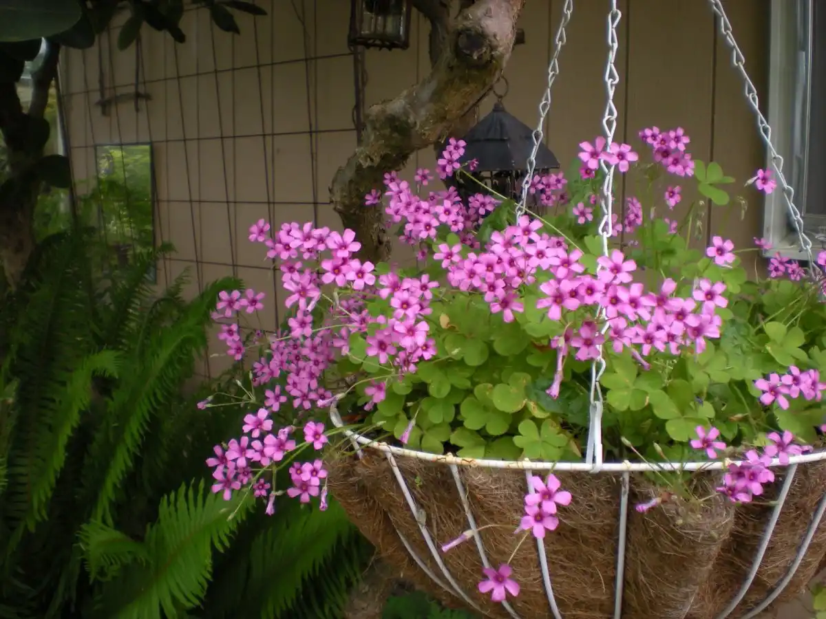Улюблений багатьма ампельний вид кислиць, що заслужив прізвисько конюшини щастя. кислиця рожева (Oxalis rosea) – підкорює не тільки гнучкими, довгими черешками та яскравим забарвленням зелені, але й схожістю трійчастого листя на конюшину. Ніжна зелень, що створює в підвісних кошиках чарівні каскади, контрастує з яскравими рожевими, чотирипелюстковими квітками.