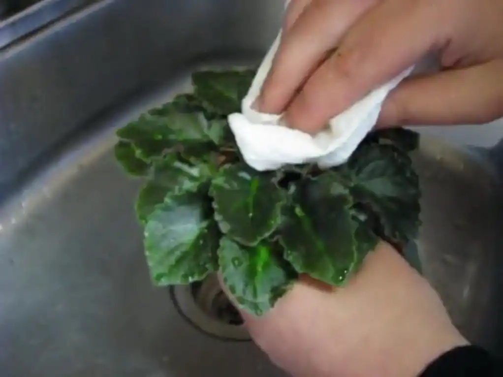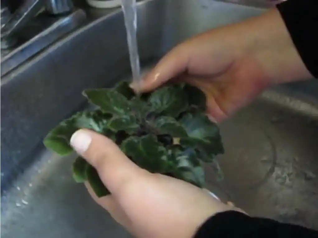 Миє листя фіалок завжди під проточною, теплою водою. Якщо доступу до теплої води немає, то використовують ємності великого об'єму, наповнені водою (заздалегідь готують одну ємність для обмивання, а другу - для ретельного полоскання). Температура води має значення: ні холодна, ні занадто гаряча вода не підійдуть.
