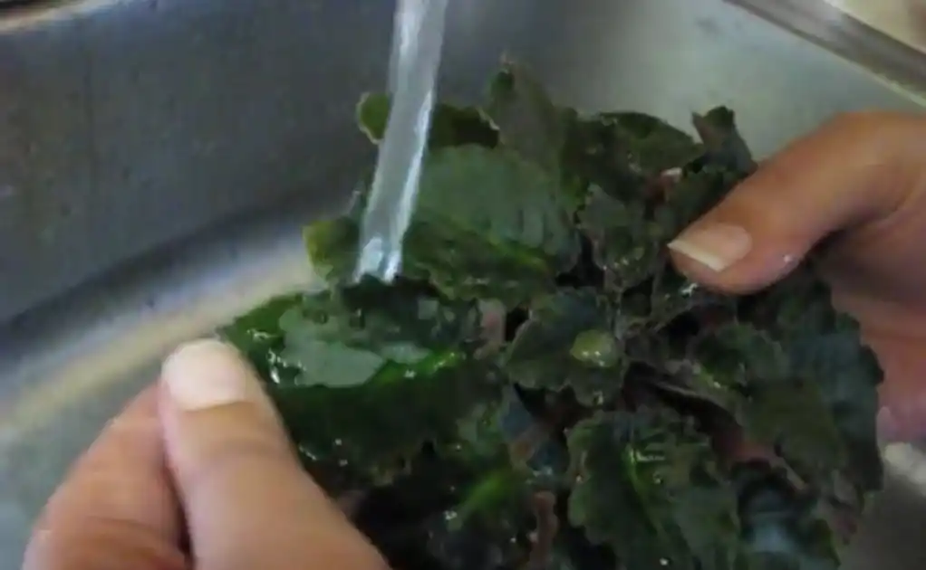 - Забруднені листи підставляють під слабкий струмінь проточної води, не даючи їй потрапляти далі, ніж на середину листа. Лист утримують під таким нахилом, щоб вода вільно стікала з краю.