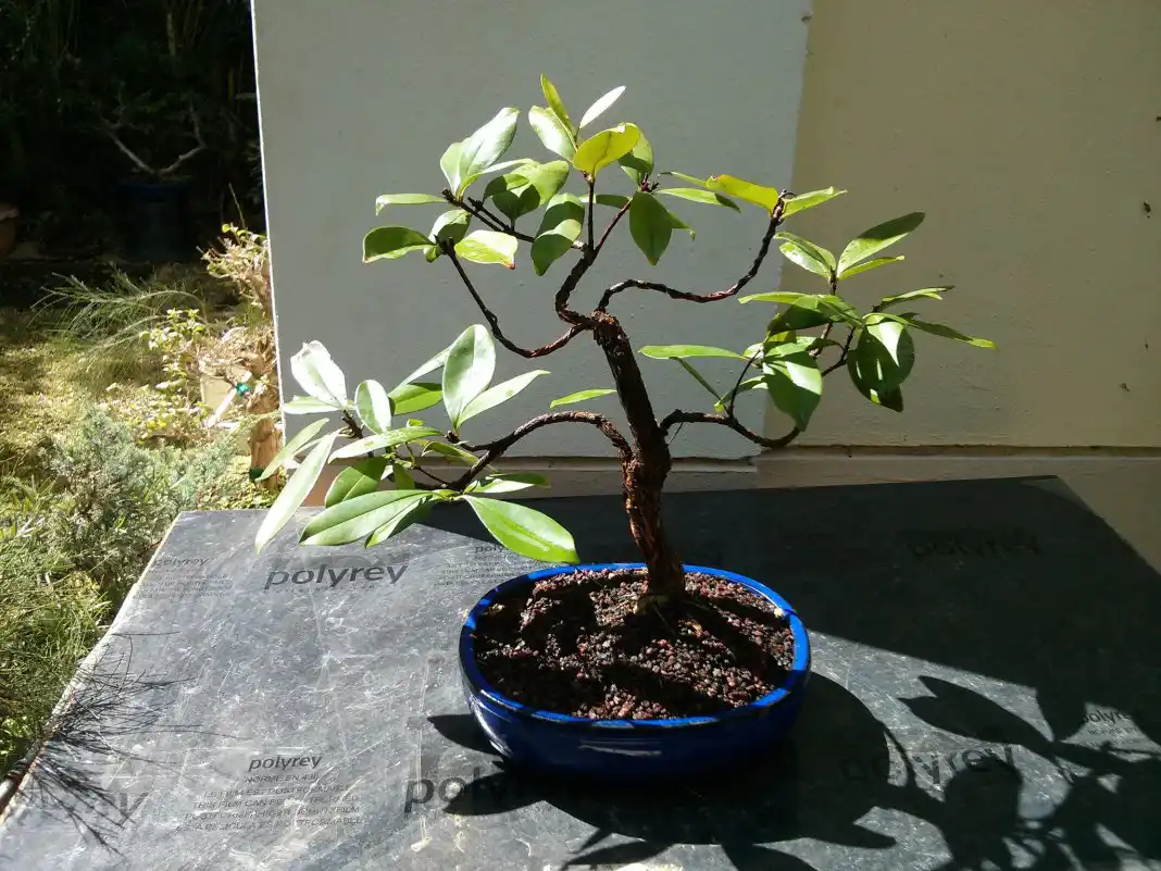 Кора на молодих пагонах євгенії дивує червоним відтінком, який у міру визрівання змінюється більш спокійні і світлі фарби. Коріння з віком зазвичай злегка випирають із ґрунту. Листя євгенії темно-зелене, овально-ланцетове з витягнутими кінчиками, дуже дрібне, сидить на гілочках супротивно. Довжина листя суринамської вишні (до 4-5 см) у кімнатній культурі у бонсай зменшена майже вдвічі. Темно-зелене забарвлення зі світлою, бляклою зворотною стороною виглядають класично. Євгенія дивує бронзовим тоном молодого листя, яке перефарбовується повільно і поступово.