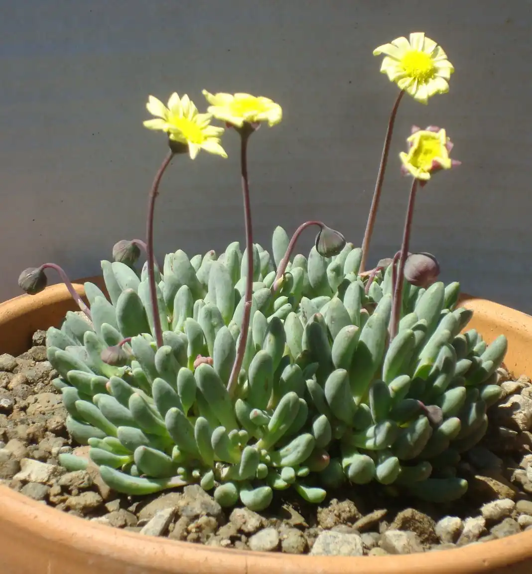 Округлий переріз листя - ще не найнезвичайніша їх риса. Адже й восковий наліт на м'ясистій зелені здається особливим. Цей сукулент навіть цвіте, впускаючи дрібні жовті кошики квіток, якими стає очевидним приналежність рослини до сімейства Складноцвітих.
