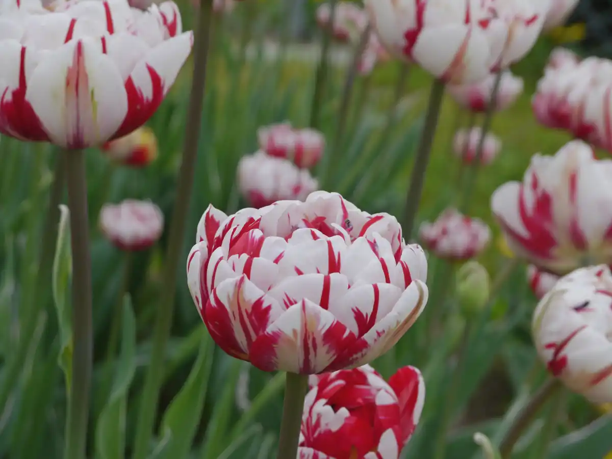 Він великий, махровий, пишний діаметром близько 10 см і висотою 7-8 см. А його білі пелюстки прикрашені яскравими червоними смугами та штрихами. Висота рослини 50-60 см. «Карнавал де Найс» досить примхливий – вимогливий до ґрунтів і добре росте лише на сонці.
