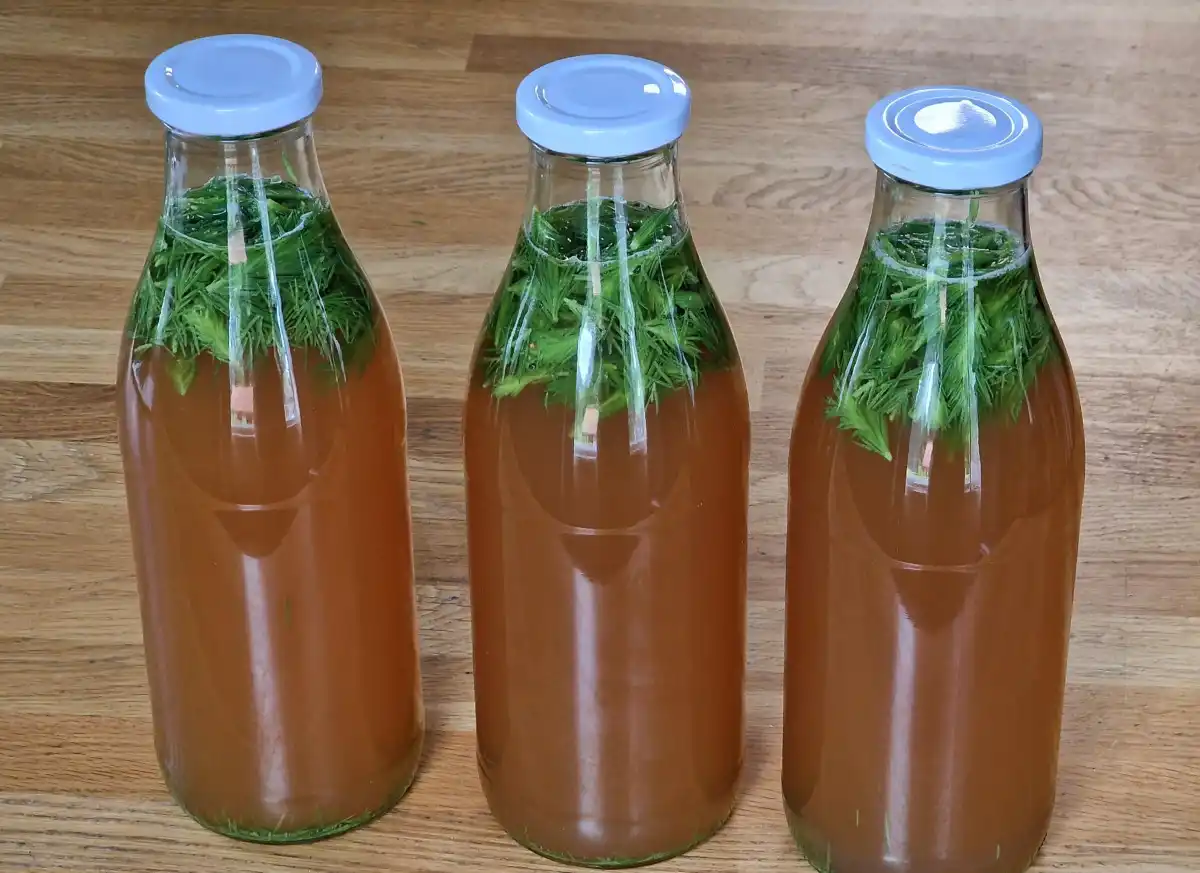 - Дві склянки подрібненої хвої та гілочок помістити в мідний посуд і залити літром окропу, нехай остигає та постоїть добу.