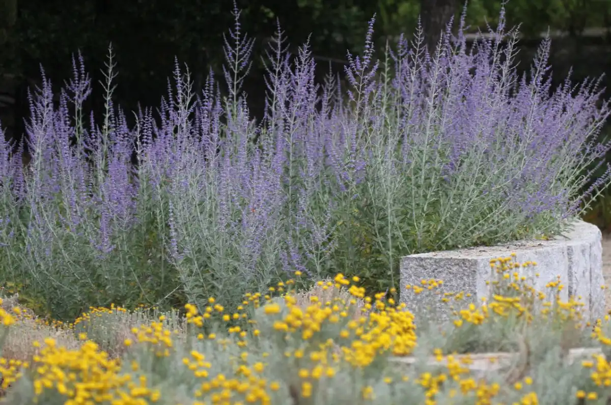 У випадку з жовто-блакитним мискбордером може статися так, що сині та блакитні відтінки, що переважають навесні, до кінця літа зникнуть. Їх повністю витіснить жовтим кольором. Важливо підібрати синьо-блакитні рослини для літа та осені, наприклад, багаторічні айстри. Колористику можна підтримати за допомогою відсипок та декору.