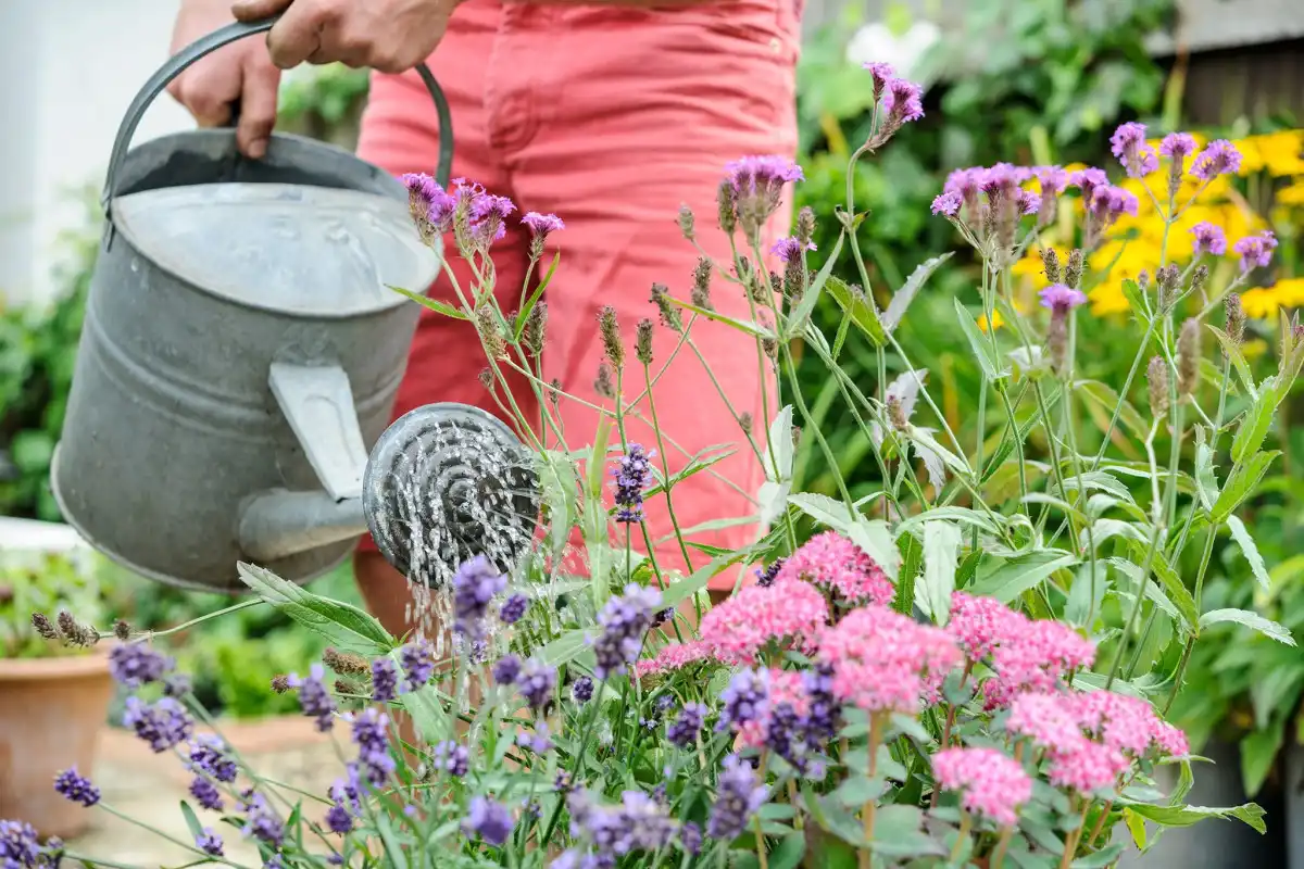 Посухостійкі багаторічники навіть у найсильнішу спеку досить поливати раз на тиждень, а вологолюбним може знадобитися полив і дощування. Рослин, схильних до хвороб і шкідників, що ушкоджуються, знадобляться як мінімум профілактичні обробки. Квітучим багаторічникам з довгими квітконосами, наприклад, дельфініумам, потрібна підв'язка. Так само як і кущам, схильним розвалюватися з часом або під вагою суцвіть.