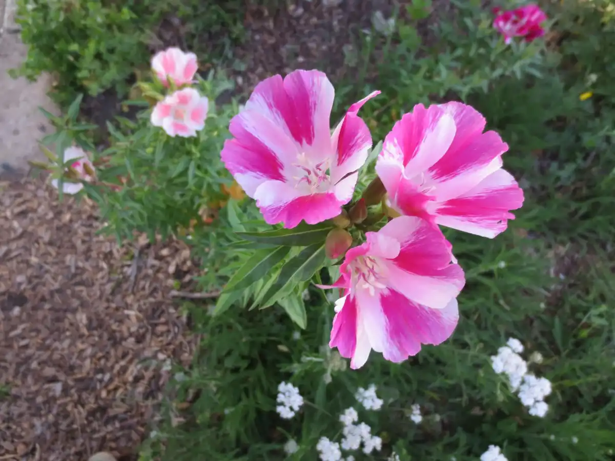 Ніготкові кларкії гарні у більшості квітників. Виняток для них - альпійська гірка (великувата) і прибережний квітник (сировато). У нас прижився варіант обрамлення вхідної зони широким бордюром із кларкії – настрій піднімається вже на вході. Ще краще вийшло, коли з одного боку доріжки посадили кларкію нігтичну, махрову суміш, а з іншого — кларкію прекрасну (годецію), теж махрову.