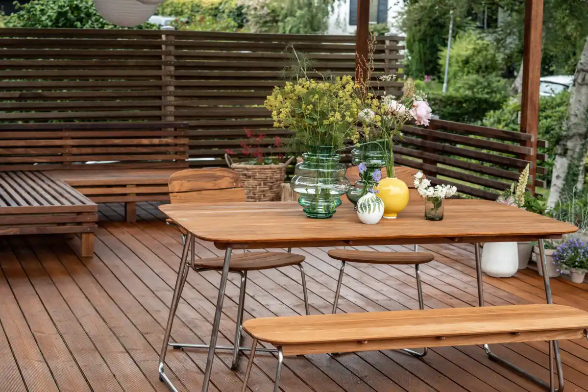 Всі меблі та малі архітектурні форми виконуються здебільшого з дерева, рідше з каменю. Цілком доречними будуть і легкі плетені меблі. Краще залишити дереву його натуральний колір, підкресливши малюнок і фактуру. Або обмежитися неяскравими природними фарбами: відтінками зеленого, коричневого, сірого та бежевого.
