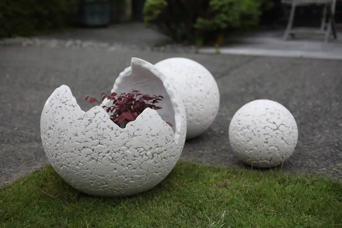 Ефект контрасту можна додати, розмістивши в саду світлі кашпо з рослинами, арт-об'єкти, садові меблі. До речі, всі ці контрастні доповнення теж можуть бути виконані з бетону.