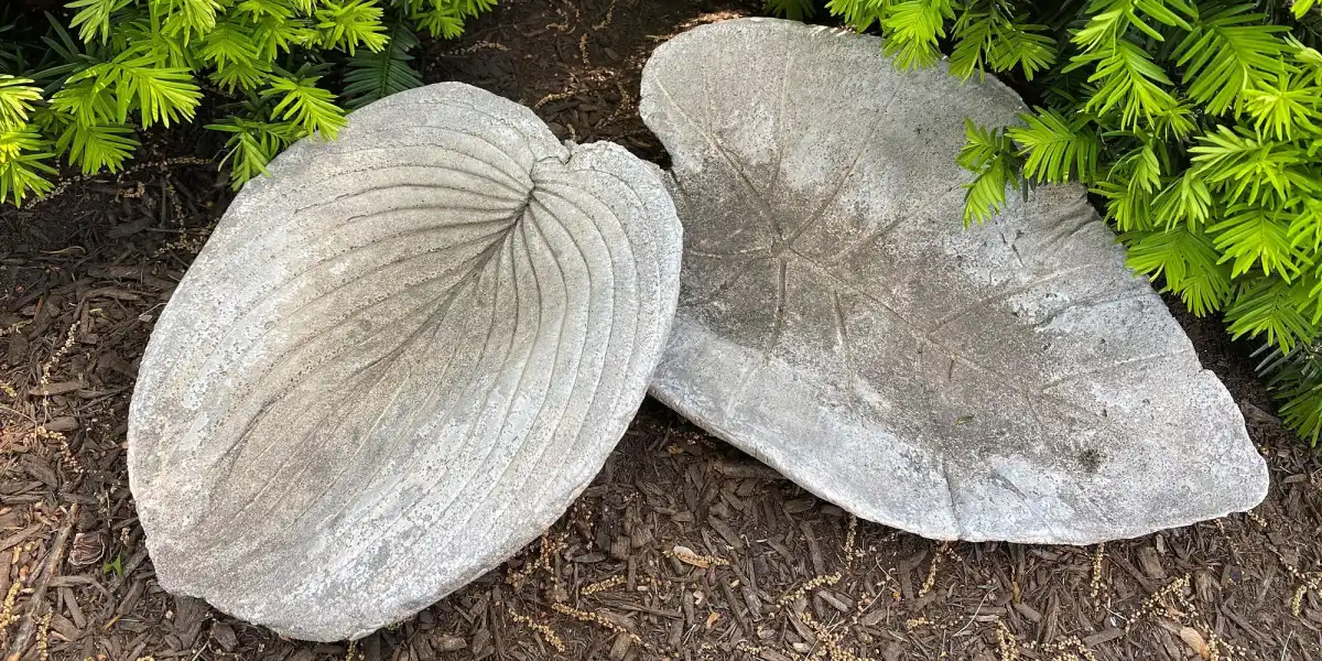 За основу можна взяти будь-який «трафарет», наприклад, великий лист цікавої форми з вираженими жилками. Приготуйте суміш із цементу, піску та пластифікатора для бетону. Помажте листову пластину тонким шаром рідкого бетону: так краще проявиться малюнок. Бажано укласти лист на опуклу поверхню виворітною стороною вгору, щоб зберегти об'єм і природну форму. Поки бетон на застиг, кладемо поверх тонку армуючу сітку, щоб вироб стала більш міцною, і знову промазуємо тонким шаром бетонної суміші.