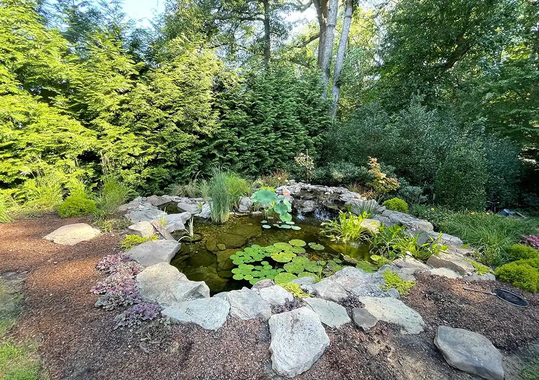 Щоб підкреслити природність декоративного водоймища, як правило, береги оформляють кам'яними валунами, а мостіння виконують з плитняку. Ту ж задачу з успіхом вирішує бетон. Наприклад, прес-бетон, що імітує натуральний камінь.