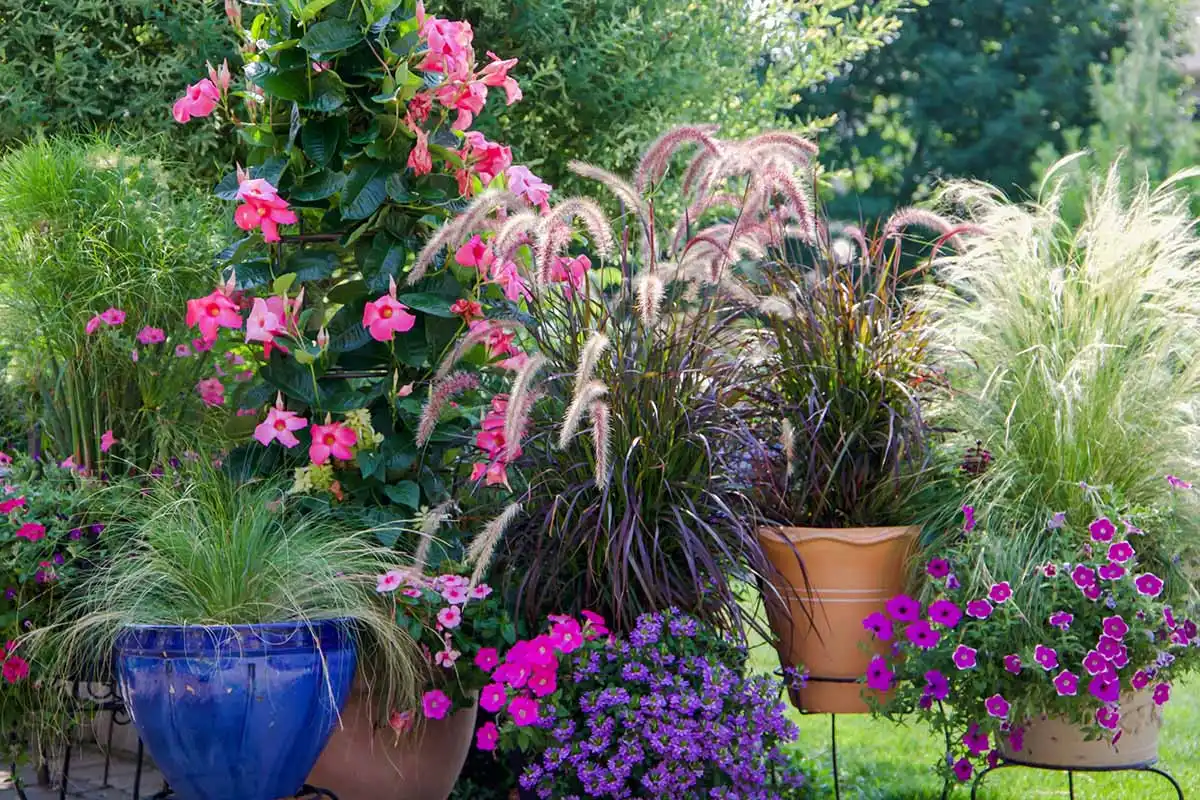 Створіть композицію в теплих тонах. Золотий, бардовий, помаранчевий, фіолетовий, багряний чудово перегукуватимуть із опадаючим осіннім нарядом дерев та чагарників. Відповідне забарвлення мають іпомея батат, декоративна осока, колеуси та багато сортів петунії та калібрахоа.