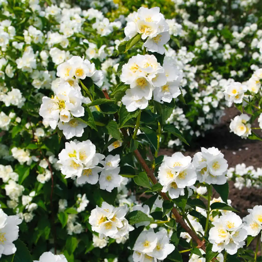 Компактний гібридний чубушник 1,5×1,2 м зі стройною архітектурною кроною і вертикальними трохи розбіжними в сторони гілками. Середнього розміру прості або напівмахрові чашоподібні чисто-білі квітки зібрані в щитковидні суцвіття, що прикрашають кущ у червні-липні. Має дуже приємний аромат.