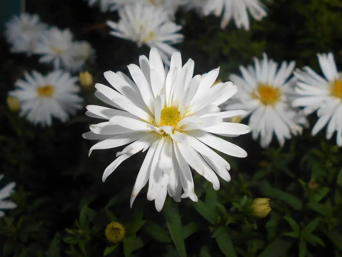 Невисокі айстри, що утворюють напівсферичну густу «подушку» заввишки до 30 см. Суцвіття — класичні кошики-«ромашки» з вузькими пелюстками білого кольору і жовтим центром. Відрізняються термінами цвітіння: "Сноуспрайт" (Aster dumosus 'Snowsprite') цвіте у серпні-вересні, "Шнєєкіссен" (Aster dumosus 'Schneekissen') підхоплює естафету у вересні і цвіте до кінця жовтня.