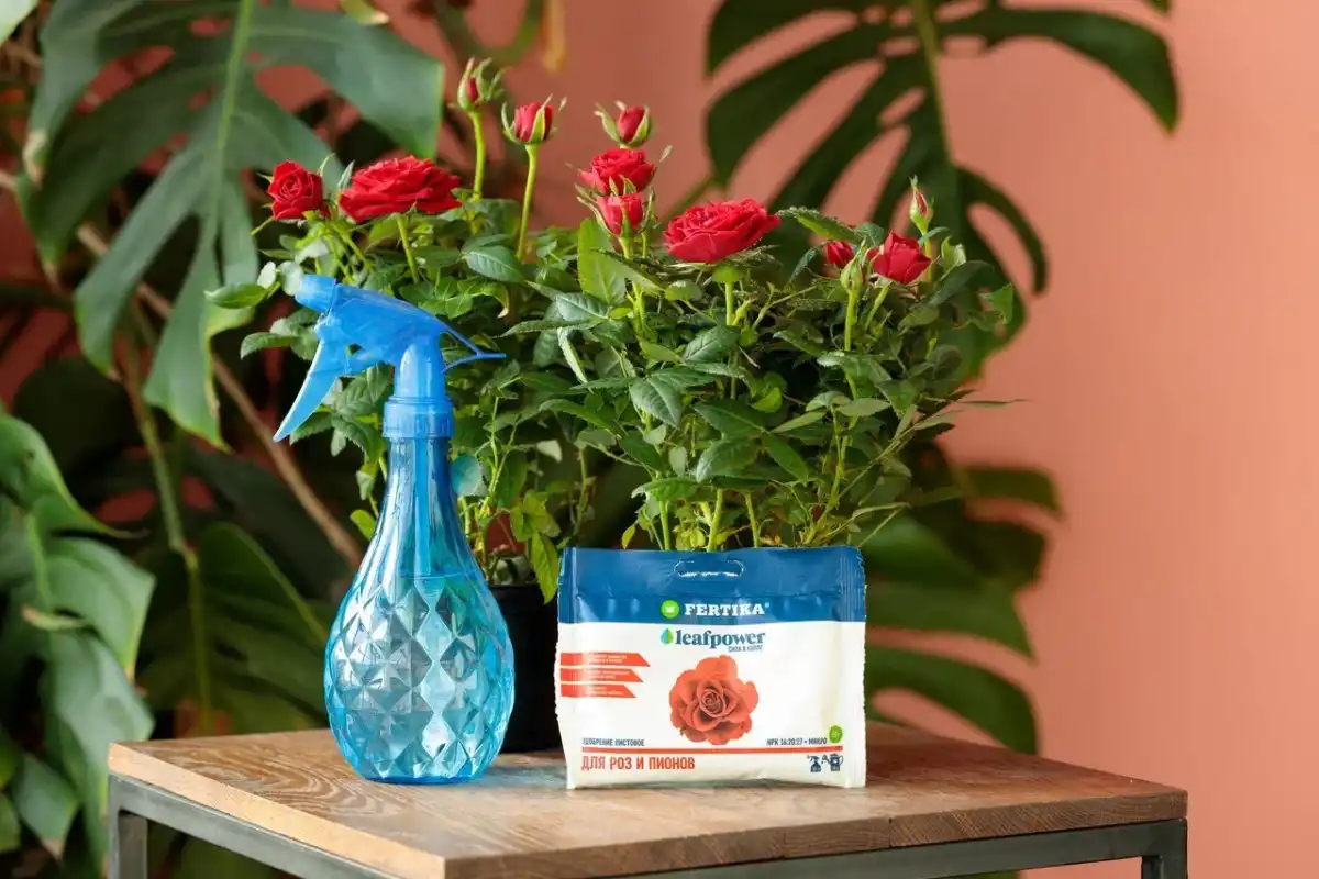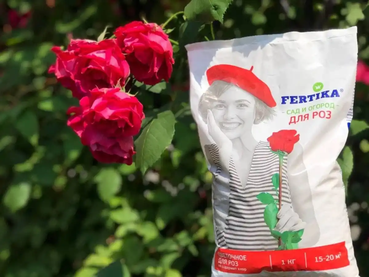 Цеводорозчинне Фертика LEAF POWER для троянд і півонів — 10-15 г на відро води з нормою витрати 3-5 л під корінь на один кущ з періодичністю внесення 10-14 днів. Або рідке Фертика Кристалон для троянд — 5-10 мл на 1 літр для підживлення кущів у відкритому грунті, теплицях і кімнатній культурі (кожні 10-14 днів по серпень включно).