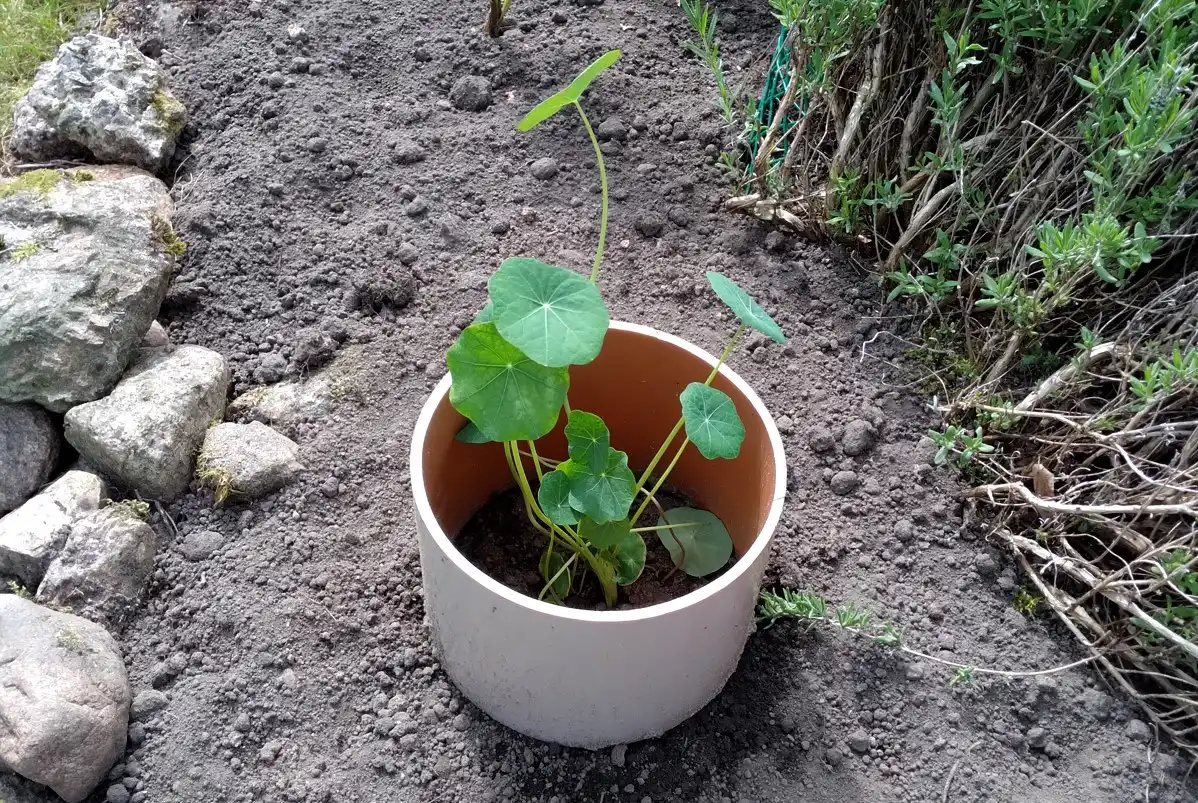 Після будівництва будинку у нас залишилися пластикові труби великого діаметру. Ми нарізали їх на шматки, заввишки 30 см. Вийшов незамінний пристрій для захисту декоративних рослин. Обрізки труб надійно захищають молоду розсаду від ушкоджень вітром і притінюють невисокі рослини від сонця.