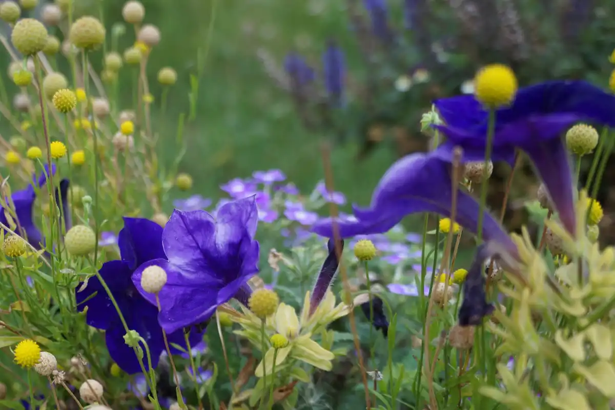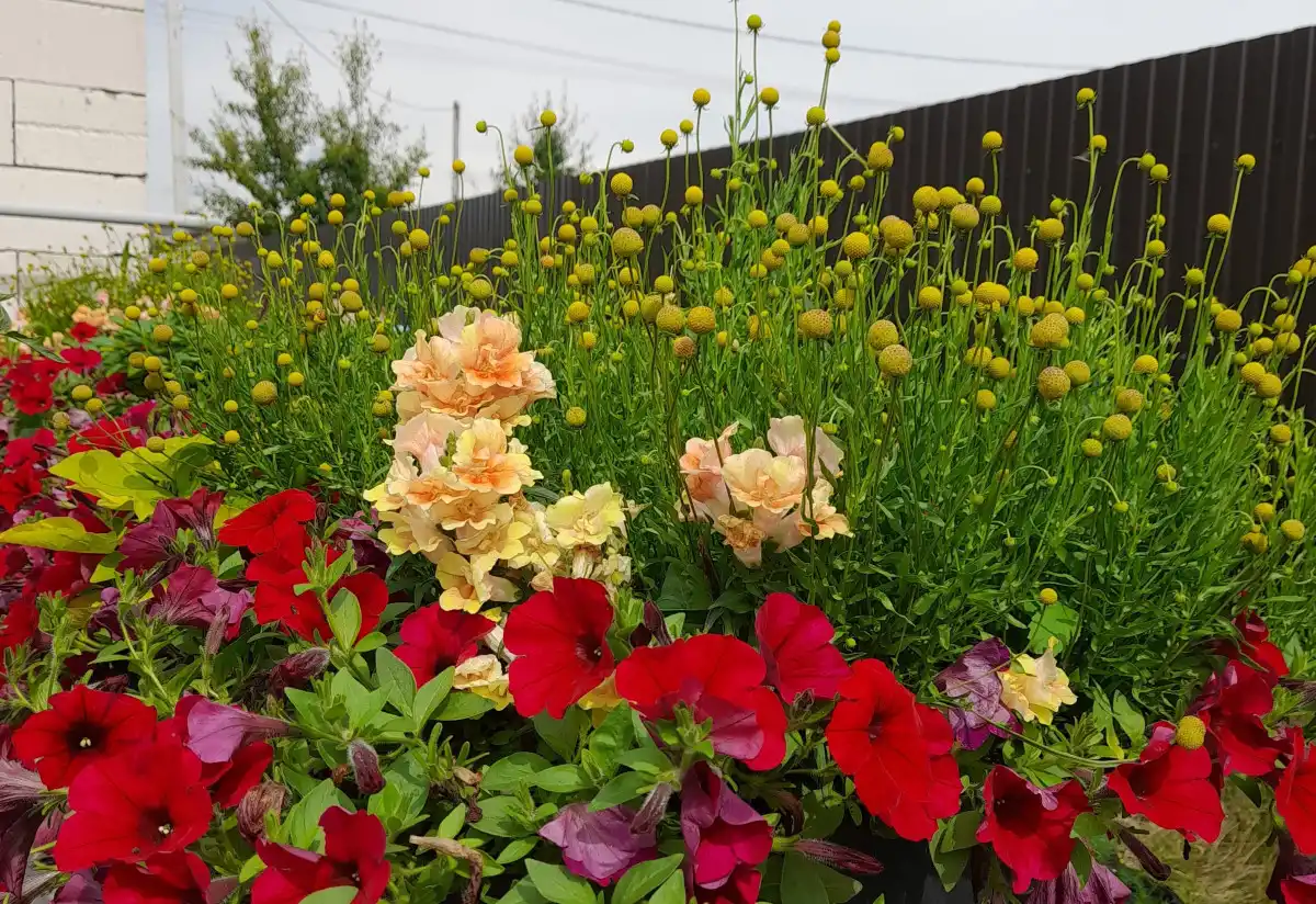 Оскільки це однорічна рослина, я вирішила вписати її в контейнерний сад разом з іншими літниками. Кульки у цефалофори дуже невеликого розміру (менше 1 см в діаметрі), тому вони ефектно контрастують з великими квітками петуній.