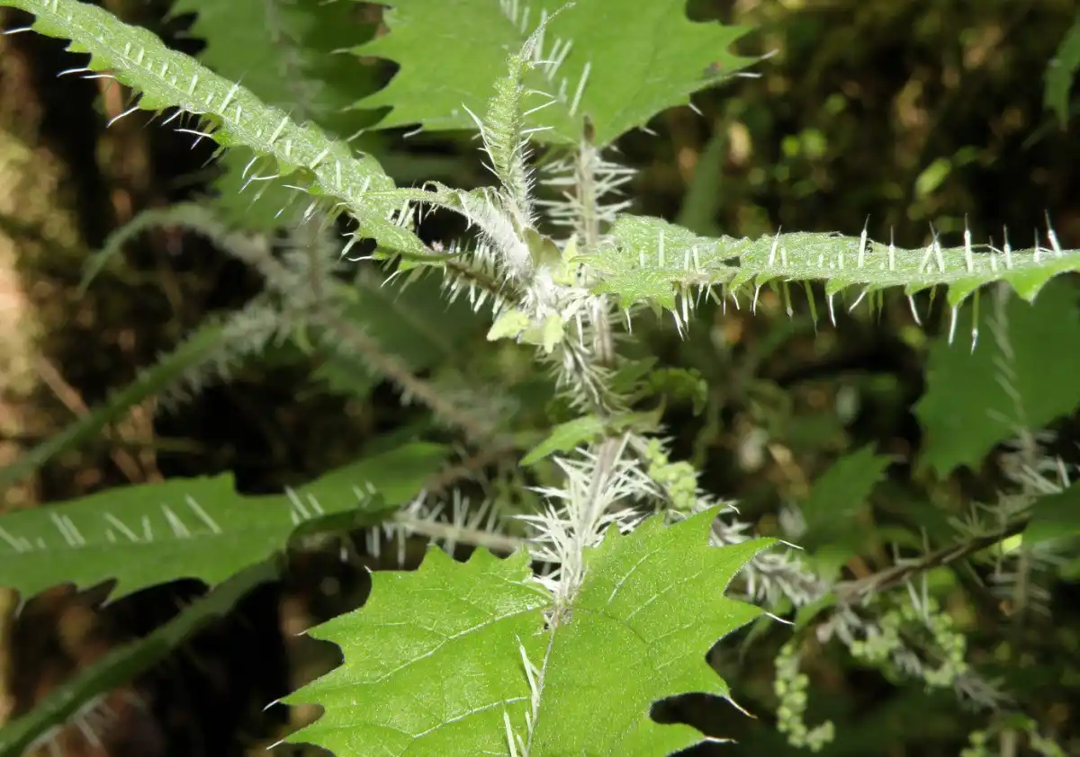Це багаторічний чагарник близько 3 м заввишки (рідше - до 10 м) з серцеподібним листям, з ніг до голови покритий майже непомітними 5-міліметровими трихомами (тонкими волосками), що містять небезпечний нейротоксин, аналогічний токсину конус. При дотику до будь-якої частини рослини трихоми впиваються в шкіру, викликаючи найсильніший хімічний опік.