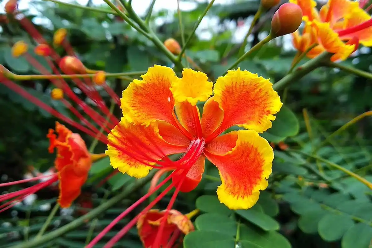Як правило, це чагарник до 3 м заввишки. Павлиня квітка теплолюбна і не переносить зниження температури нижче -5-7 градусів, зате добре росте в кімнатних умовах. Головна відмінна риса – дивовижне і практично безперервне цвітіння. У регіонах із невеликими морозами, наприклад, у Сочі, є період спокою, а листя на недовгий час опадає.