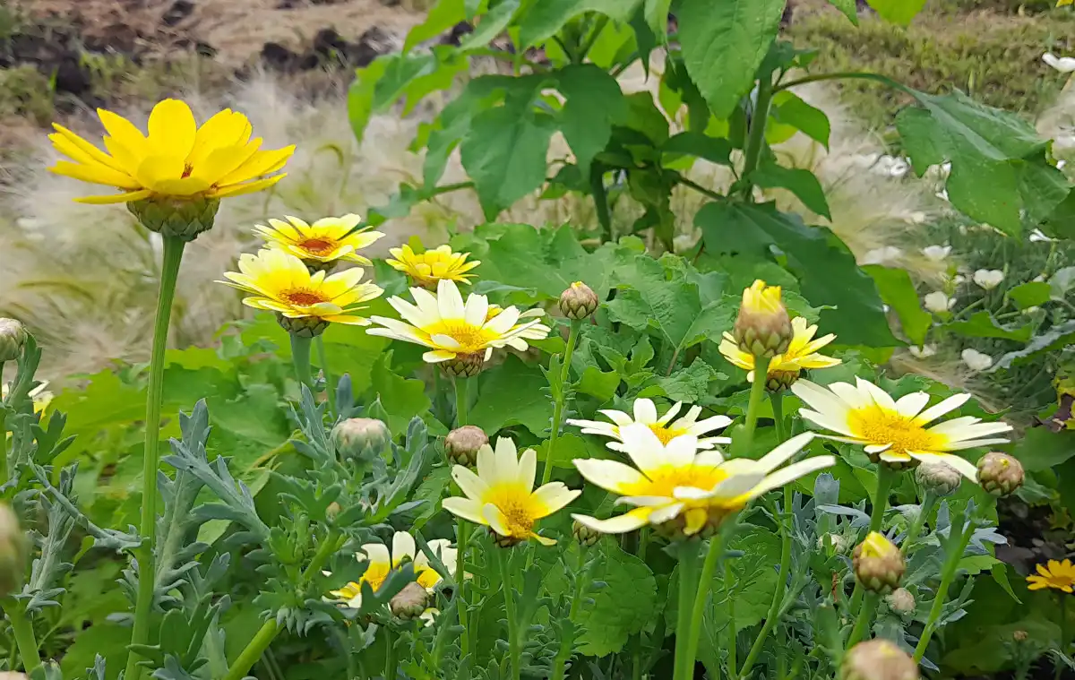 Для мене ж це просто швидкозростаюча однорічна квітка. У хризантеми овочевої (Chrysanthemum coronarium) дуже гарне перисте листя. При густому сівбі вона створює ефект великого куща. Квітки двоколірні: різних відтінків жовтого, часто з контрастною серединкою. Під час цвітіння хризантема виглядає дуже ошатно та життєрадісно.