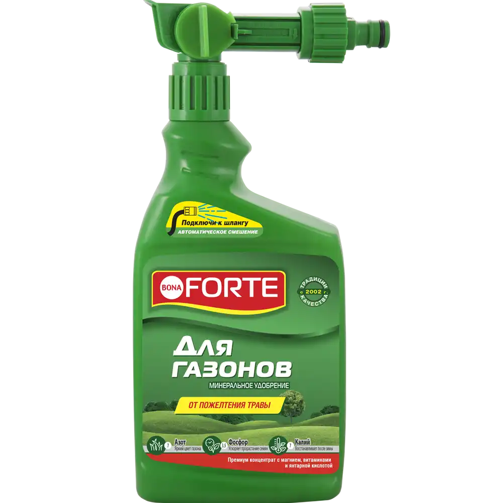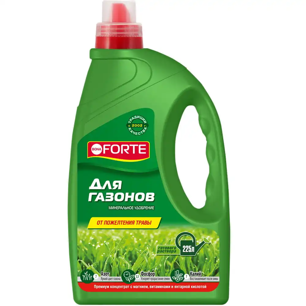 Після механічного видалення моху проведіть аерацію газону та підживіть рідкими добривами Bona Forte. Вони простимулюють зростання трави та дозволять їй «піднятися» після стресу. Невеликі лужка можна полити добривом для Газонів, що випускається у каністрі об'ємом 1,5 л. Цього вистачає для приготування 225 літрів живильного розчину. Підживлення великих площ простіше провести за допомогою добрива Газонне з ежектором. Розпилювач допомагає швидко та рівномірно підгодувати газон. Для його застосування потрібен лише шланг та підключення до водопроводу або портативного насоса.