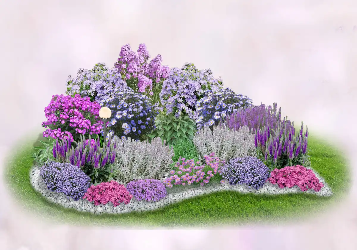 На цьому прикладі можна наочно побачити, як шляхом правильної комбінації простих і доступних багаторічників можна досягти постійного цвітіння. На картинці представлений безперервно квітучий міксбордер у спокійній рожево-бузковій гамі для сонячних місць.
