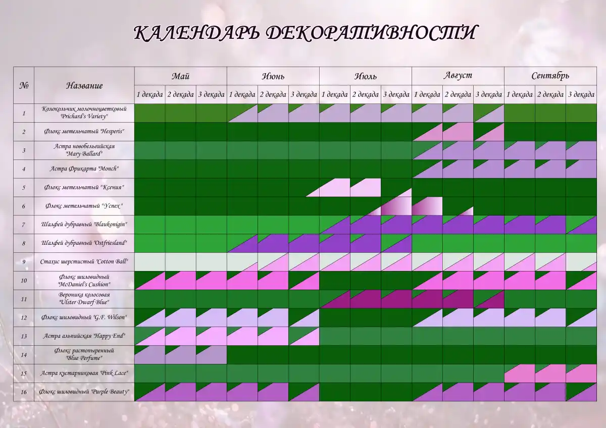 При плануванні такого міксбордера рекомендується скласти календар цвітіння, щоб унеможливити «випадання» якогось тимчасового відрізка та забезпечити збереження обраної колірної гами у кожний момент.