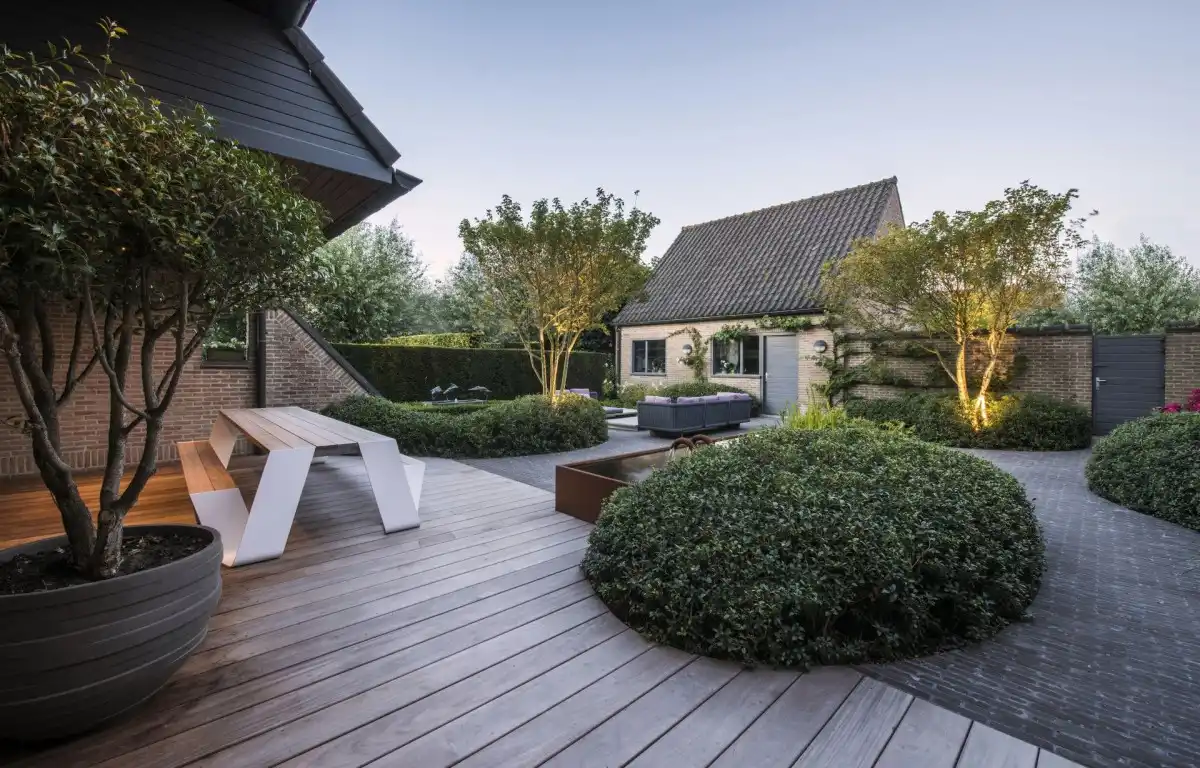 Ця елегантна тенденція натхнена подорожами, саме такий дизайн можна побачити у європейських маєтках, виноробнях чи розкішних готелях. Це викликає відчуття елегантності, «нальоту історії» та традицій. Щоб повторити подібний стиль на своїй ділянці, вам потрібно дотримуватися обмеженої палітри кольорів (наприклад, зелений і білий) і повторювати форми в об'ємах і ряди для сильного візуального впливу. Топіарії, скульптурні рослини, живоплоти з хвойних і зелені стіни добре підходять для реалізації цієї тенденції. Також у цьому стилі акцентується увага на кількох квітучих чагарниках, але дуже традиційних, таких як троянди чи гортензії.