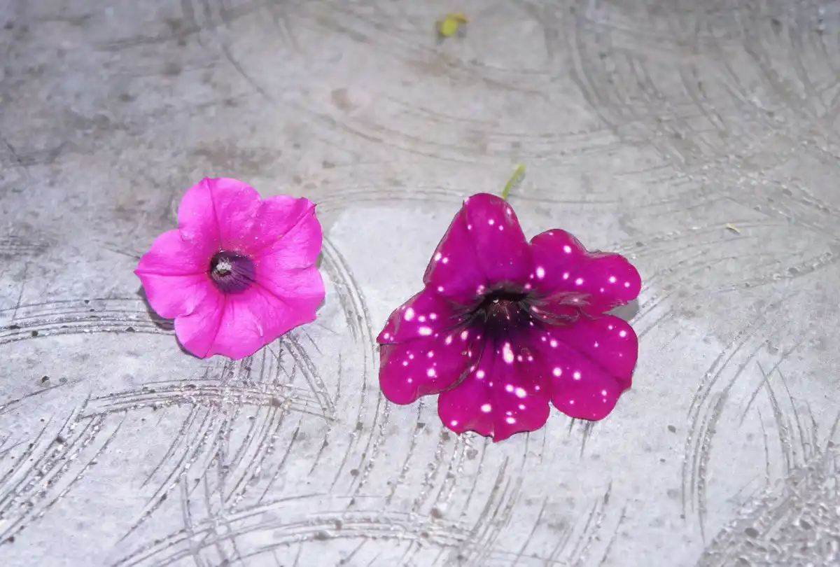 Два вирощуваних мною екземпляри дикої петунії дещо різнилися між собою. У однієї були більші квітки із закругленими кінчиками, а у другої квіточки дрібніші і кінці у них загостреніші. Також у однієї з них листя більше схоже на заокруглені листочки гібридів, а у другої незграбне.