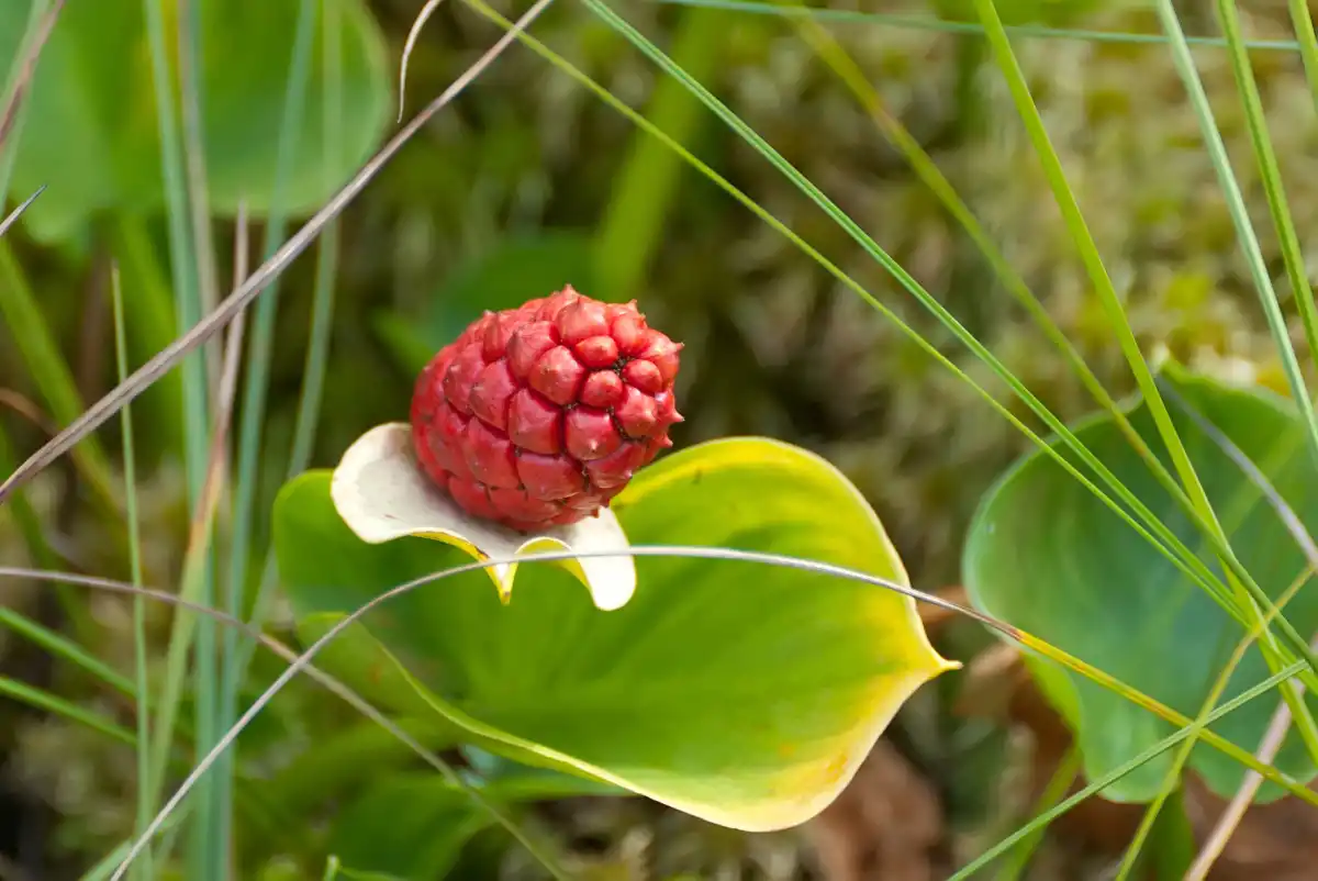 Дерен канадський (Cornus canadensis). Цей родич кущового дерева є ґрунтопокривним багаторічником, який після цвітіння білими квітками, утворює невеликий гроно з 4-7 яскраво-червоних ягідок у центрі свого мутовчастого листя.