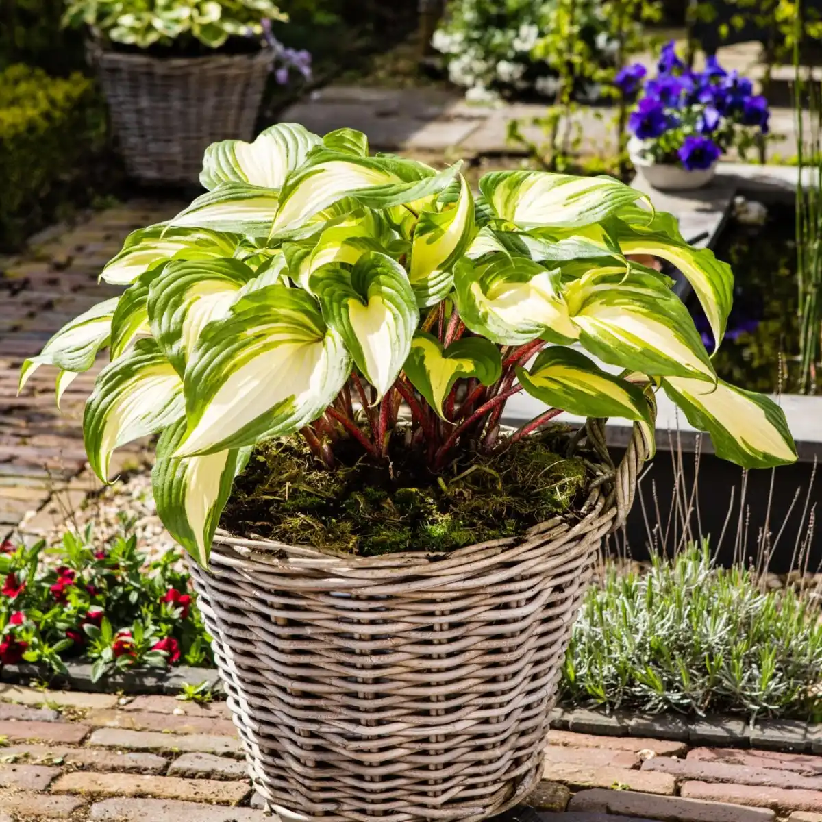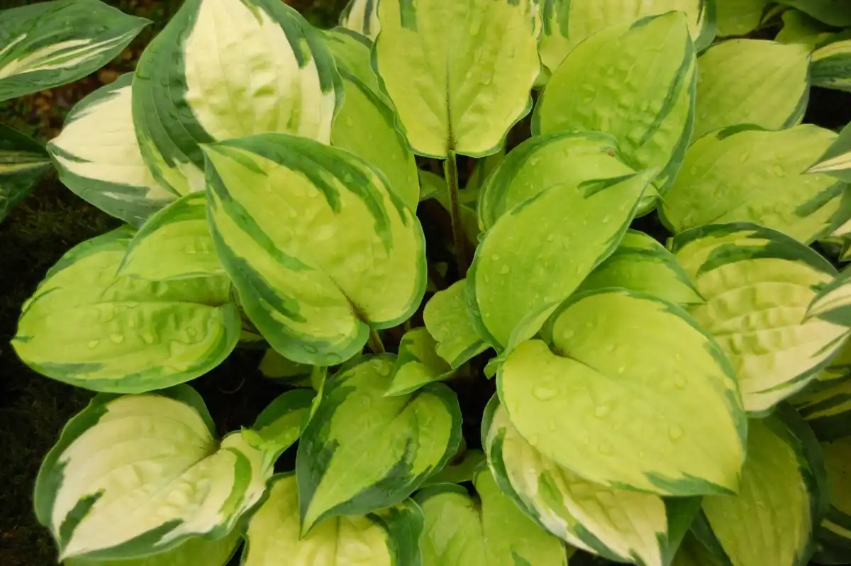Особливо ефектно виглядають хости, що поєднують жовте листя з червоними черешками. Завдяки цьому контрасту, червоний колір здається ще інтенсивнішим. Подібне цінне поєднання можна спостерігати у таких хост, як "Lipstick Blonde", "Fire Island", "Paradise Island".