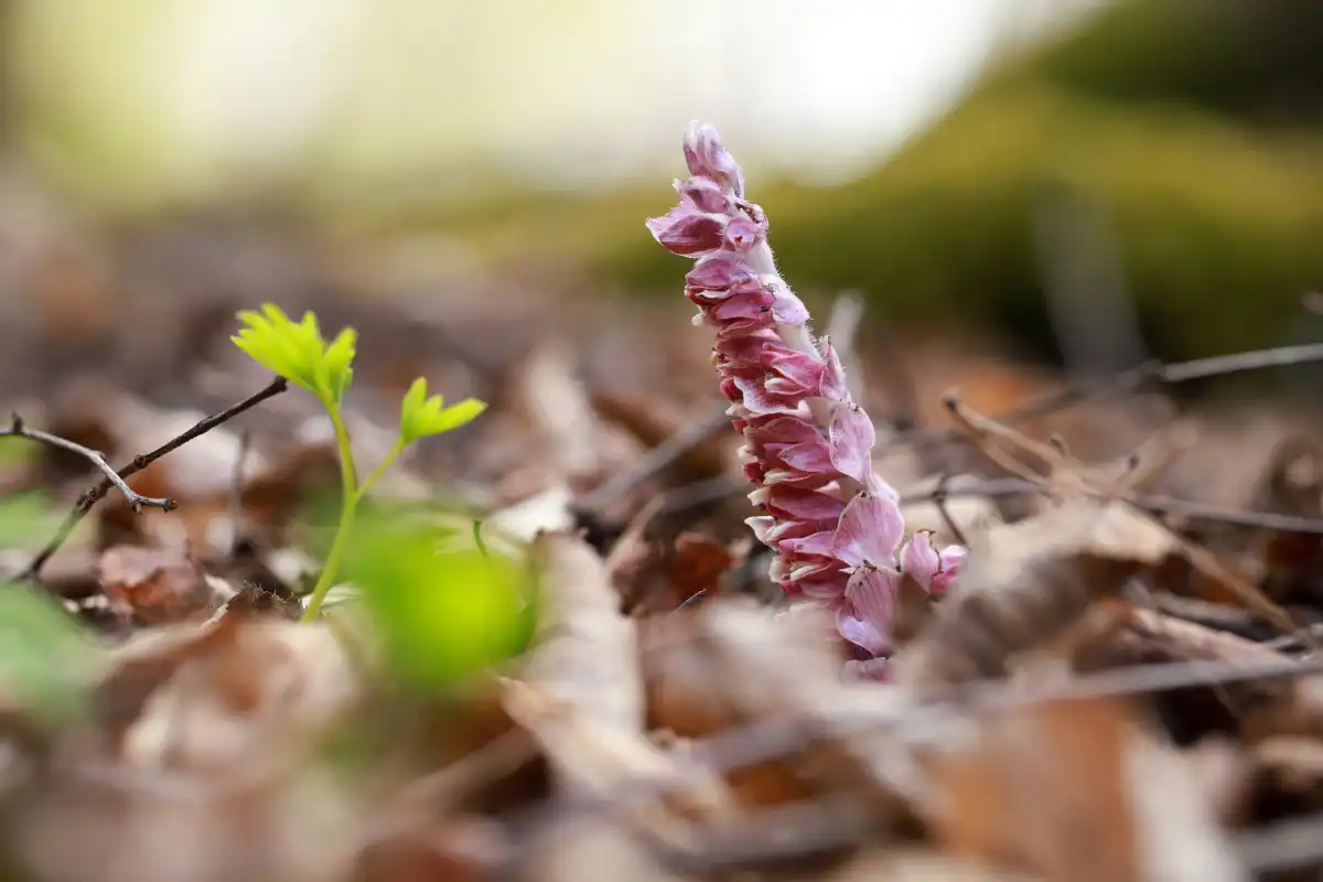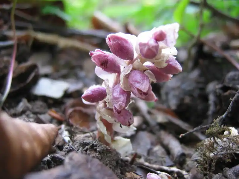 Весною з-під землі з'являються квітконоси заввишки 20-30 сантиметрів. Циліндричні двостатеві квітки білого або рожево-фіолетового кольору розташовуються на односторонніх квітконосах, що поникли. Квітки двогубі, зі стовпчиком (жіноча частина), що виходить за межі пелюсток. Запилюються квітки переважно джмелями, деякі квітки не відкриваються, і в них відбувається самозапилення. Плоди є капсулами, розділеними на дві стулки. Вони містять численні дрібні, сферичні насіння.