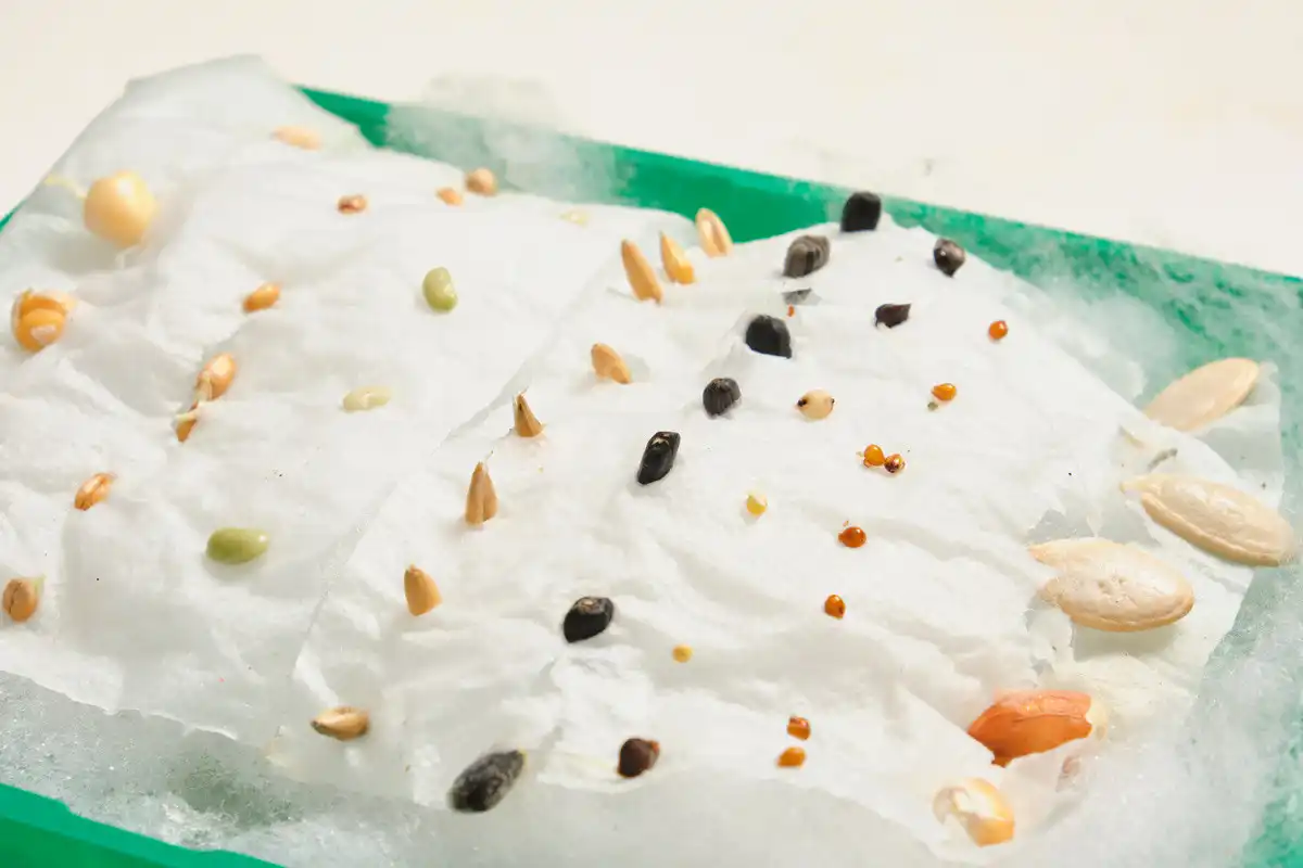 Щоб провести тест на схожість методом пророщування, візьміть кілька насіння, бажано 10, і викладіть їх у ряд на вологий паперовий рушник, серветку або ватяний диск. Складіть паперовий рушник і помістіть його в пластиковий пакет або контейнер з кришкою, щоб зберегти насіння вологим. Потім поставте в тепле місце, захищене від попадання прямих сонячних найкращих щоб уникнути перегріву, (наприклад, на полицю шафи).