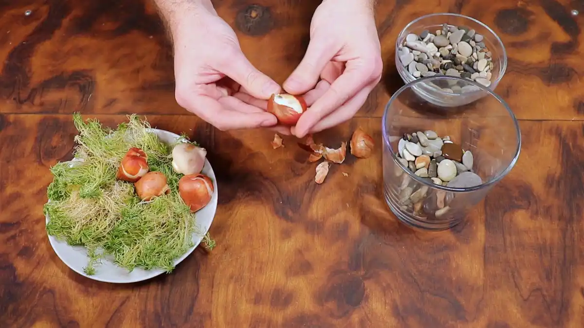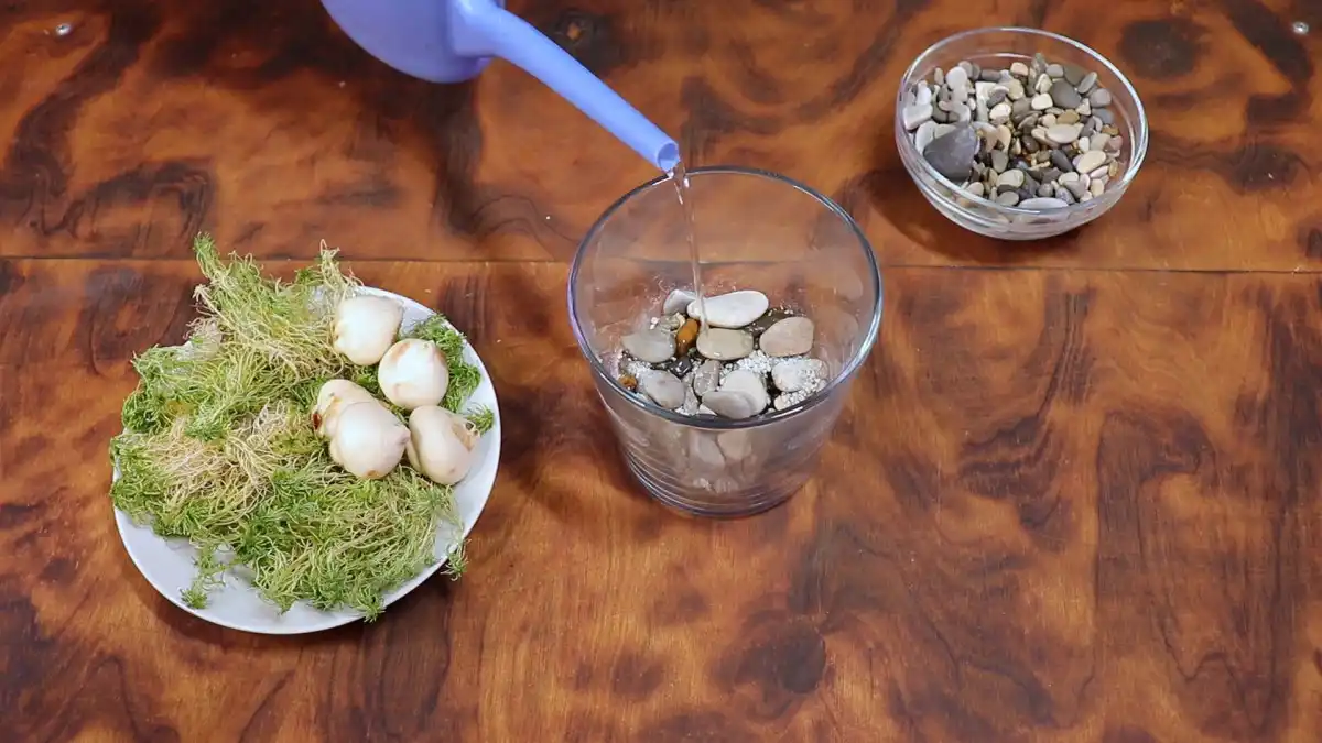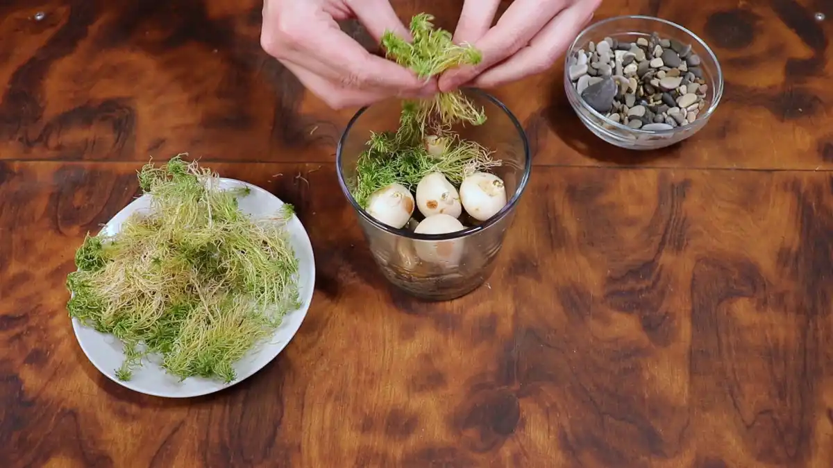 - Зафіксуйте цибулини у вазоні. Можна насипати ще трохи дрібної гальки чи камінчиків. Вони мають доходити до середини цибулин. Як «ущільнювач» також підійде мох сфагнум. Розкладіть його навколо цибулин, заповнюючи простір між ними.