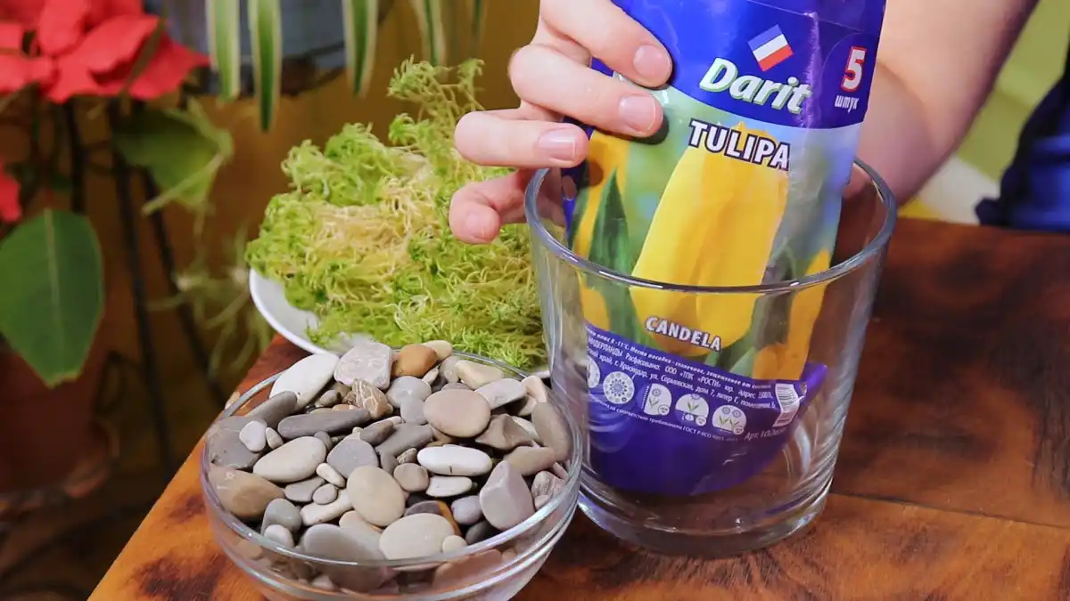 Отримати гарний букет тюльпанів у вазі з декоративним ландшафтним наповненням – чудова ідея! У цьому випадку вам не доведеться навіть купувати ґрунт.