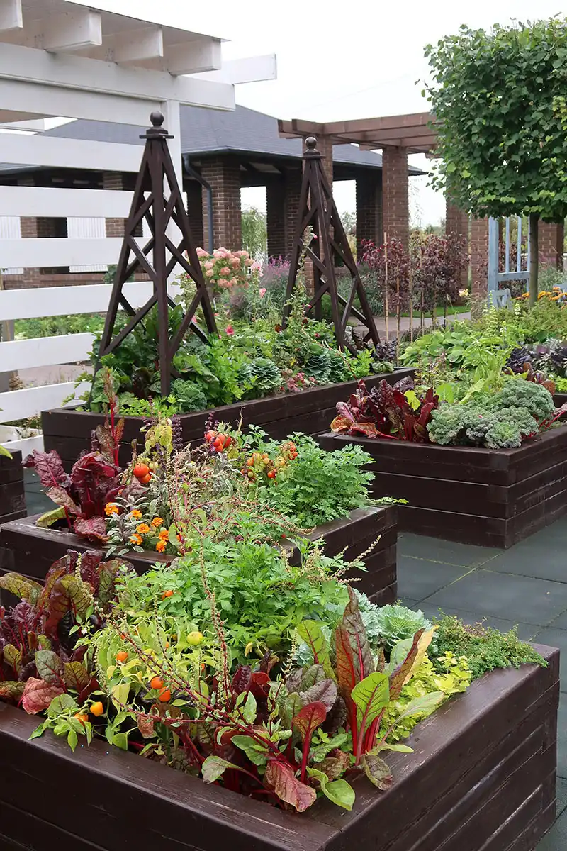 Для візуального відділення зони городу від решти саду можна використовувати легкі ширми-перголи, розмістивши на них декоративні гарбузи з оригінальними за формою плодами, квасоля вогненно-червону, що має довгі стручки і яскраві суцвіття, або гіацинтові боби з фіолетовими стручками і квітами. Також можна створити навколо городу живоплот із плодових чагарників — смородини, жимолості їстівної або агрусу.