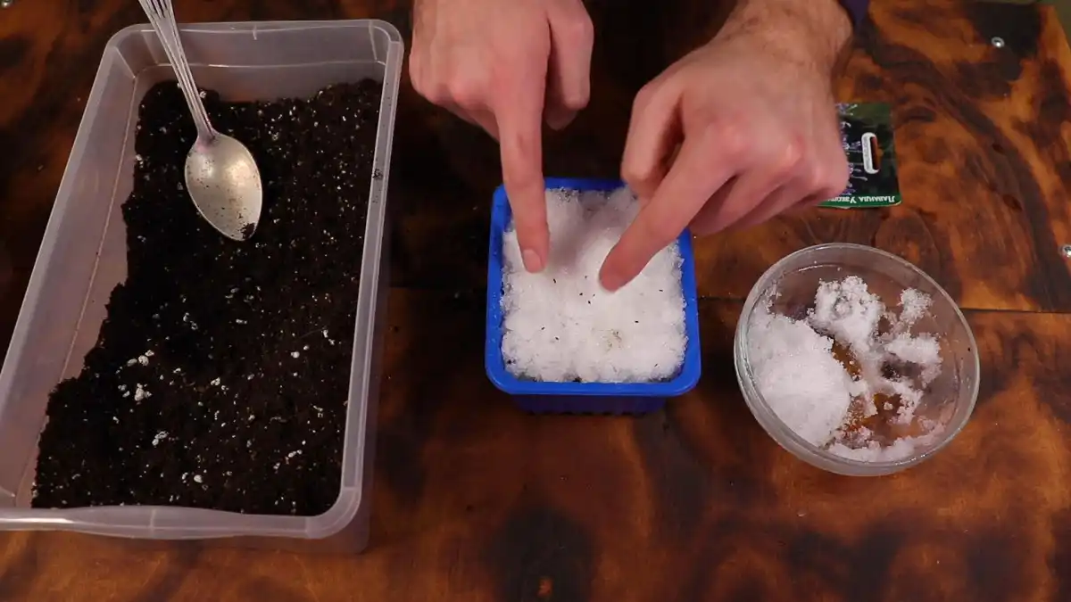 Ще один варіант шокової стратифікації – посів на сніг. У ємність насипте ґрунт. Якщо ґрунт сухий, злегка зволожте його. Не перестарайтеся з поливом. Адже поверх землі буде розкладено сніг. Його потрібно рівномірно розподілити по всій поверхні ґрунту. На сніг розміщується насіння. Їх можна зверху присипати снігом. Під дією низької температури снігу насіння пройде швидку природну стратифікацію, а коли він розтане, опуститься на ґрунт. Проросте насіння при такій посадці досить швидко.