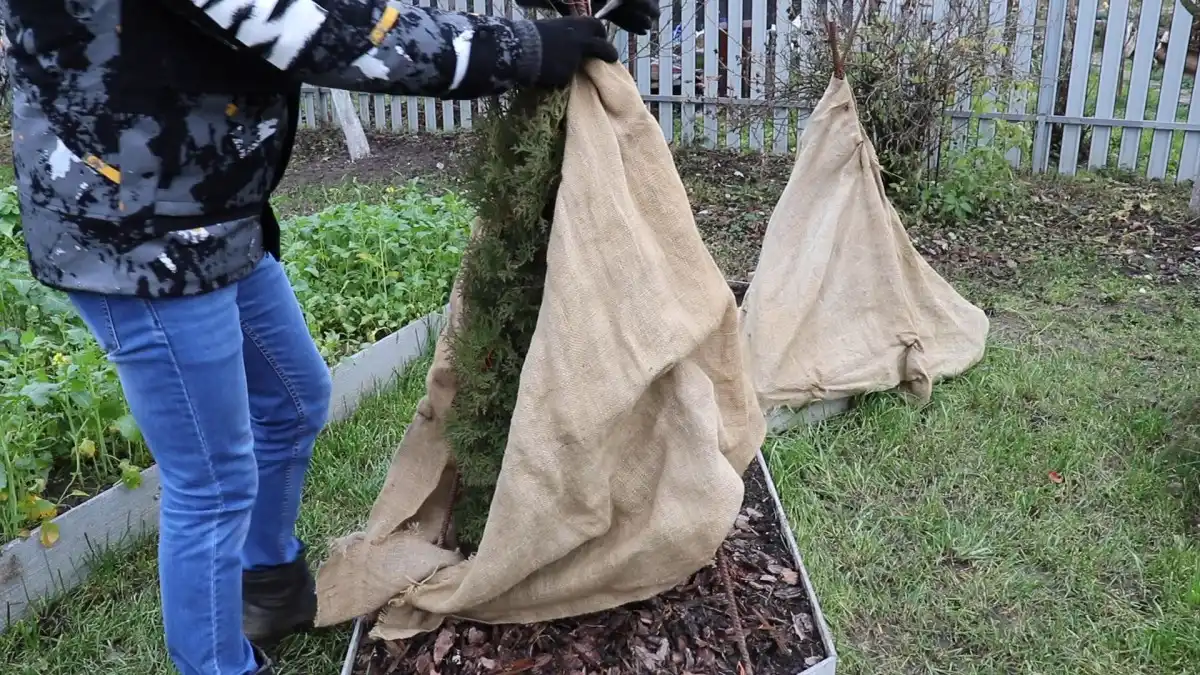 Ще один спосіб захисту туй від зимової негоди – спорудити каркас. Він також добре уберігає рослину від сонця та снігу. Робиться із трьох металевих або дерев'яних опор, які встановлюються у вигляді куреня над рослиною і щільно фіксуються до землі. Потім на каркас натягується покривний матеріал, наприклад, мішковина. Каркасний спосіб підходить для молодих рослин віком до 2-3 років.